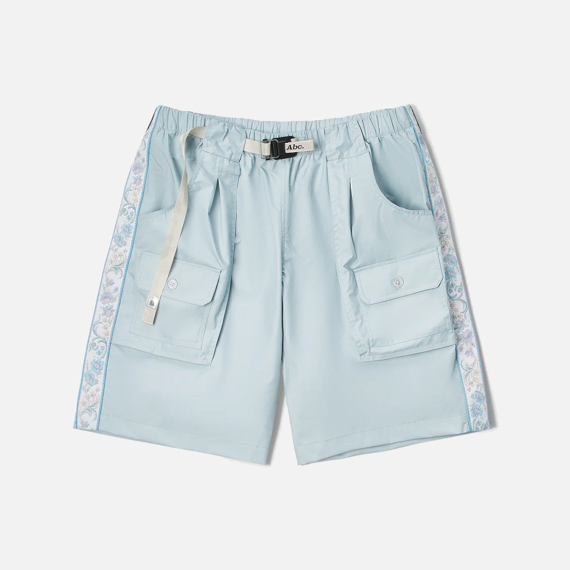 Los Angeles' Advisory Board Crystals transcends traditional streetwear by incorporating spirituality, intentionality and a commitment to wellness into their brand ethos. ABC's Waterproof Nylon Taffeta Spring Shorts are made from 100% nylon dyed laminated fabrication from Japan with front cargo pockets and floral jacquard side detail. Additional details include custom glitter buttons, magnetic adjustable belt, the signature pulltab and hologram on back waistband, woven label with clg code and collection flag labels at side seam.