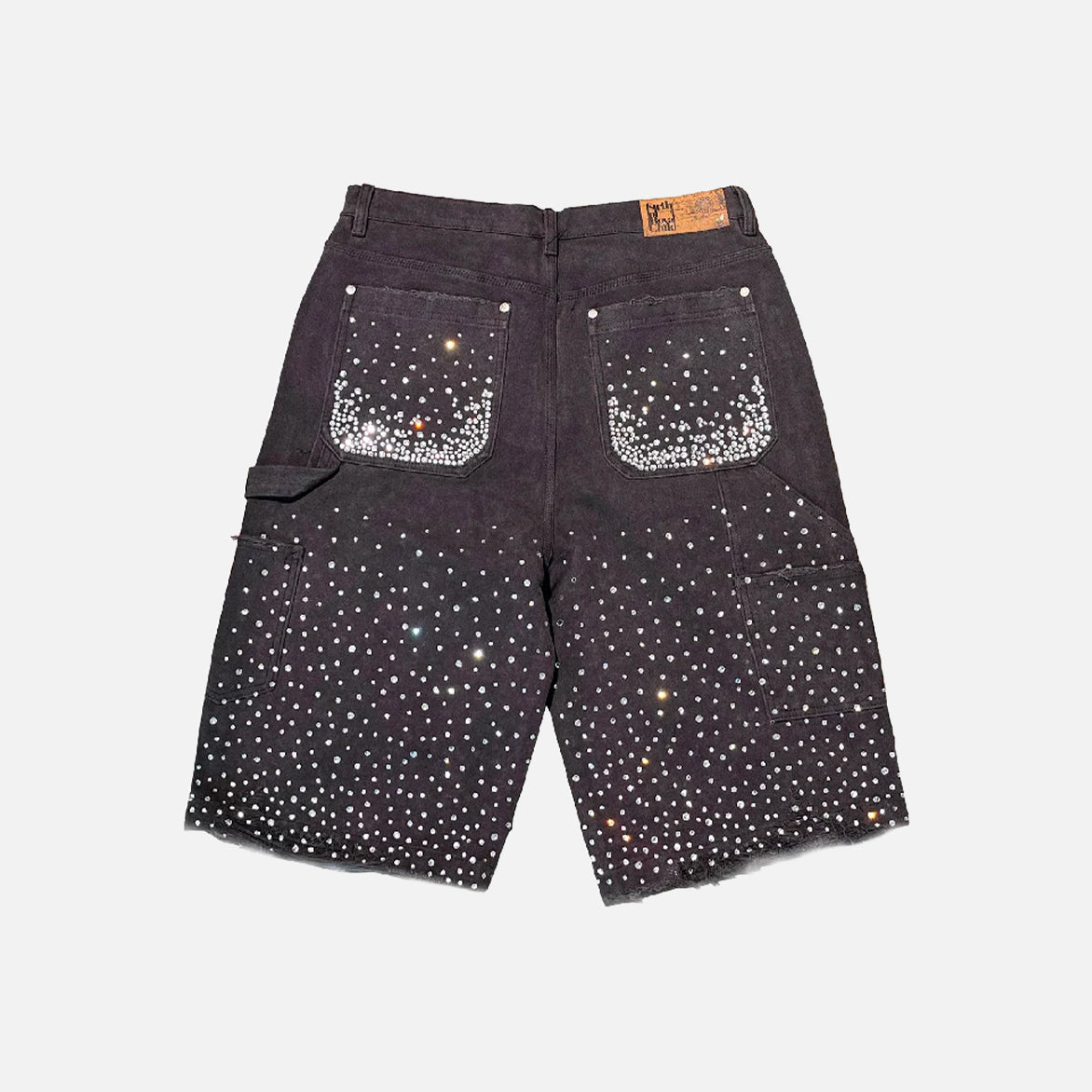 BIRTH OF ROYAL CHILD fuses vintage elements and nautical treasure hunting to create a style that blends street trends with high fashion. The 20K Diamond Jorts are inspired by the radiance of holy light, with a unique laser-cut design of rhinestones arranged in a celestial pattern. The 100% cotton denim shorts feature cascading rhinestones on the back pockets in a teardrop shape, complementing the overall dazzling glow. The raw-edge and distressed cropped design borrows from lumberjack workwear, while the heavy washing and hand-done distressing enhance the vintage feel, creating a worn-in, authentic look.