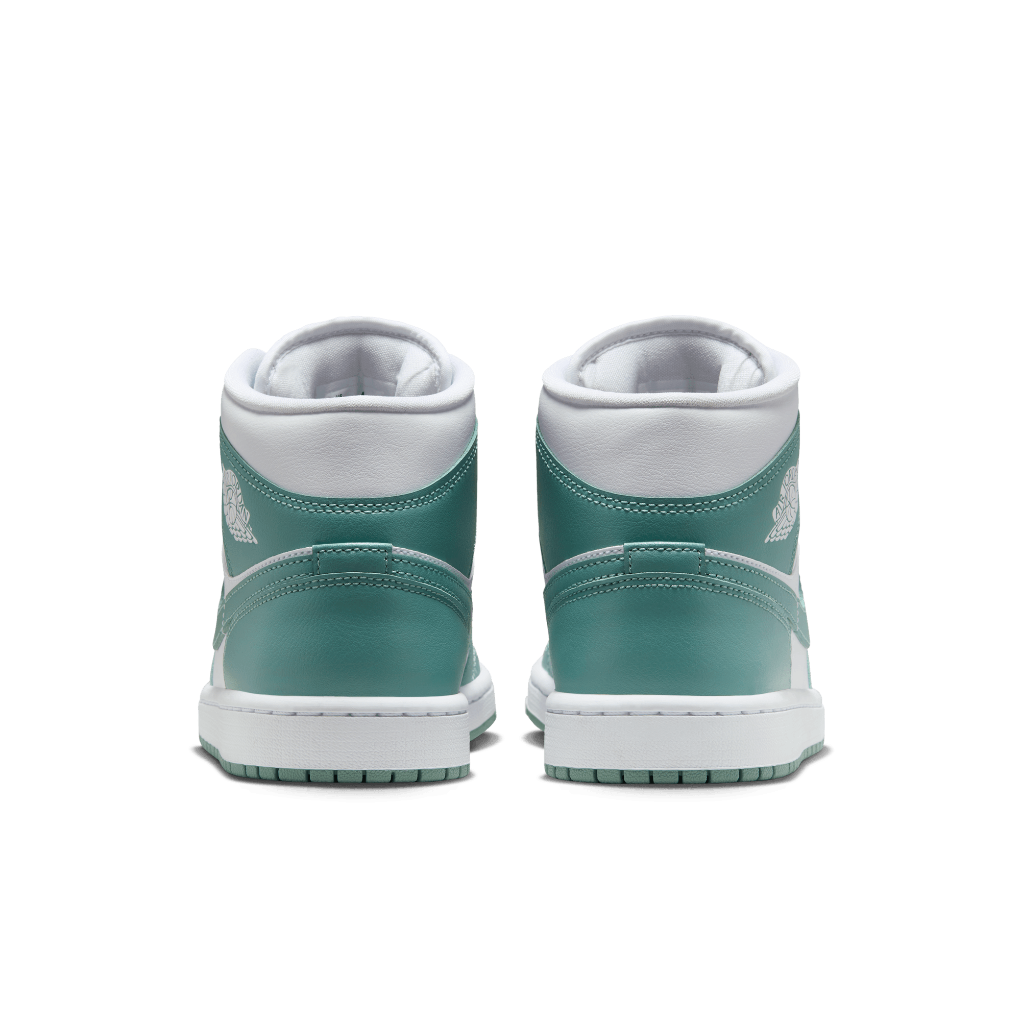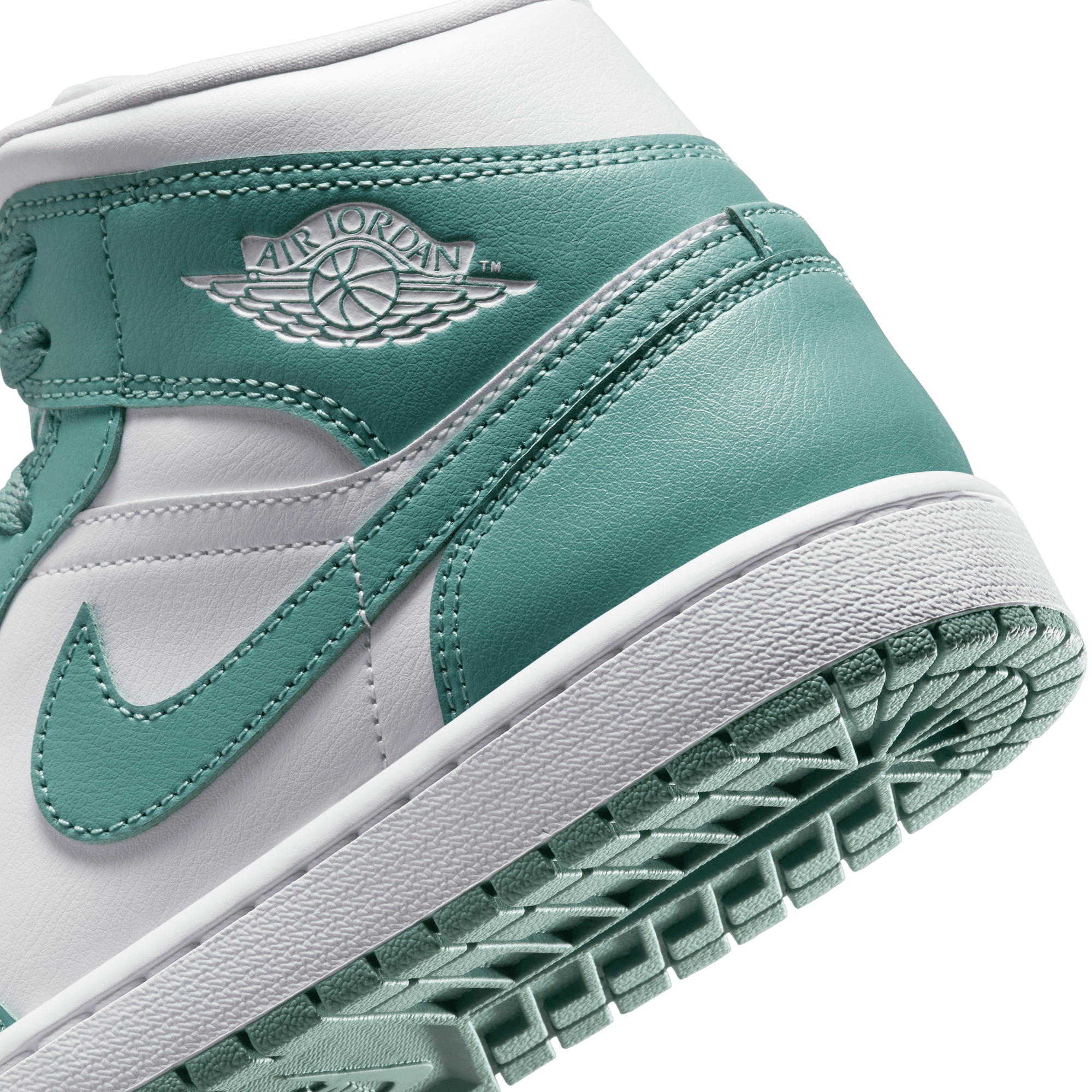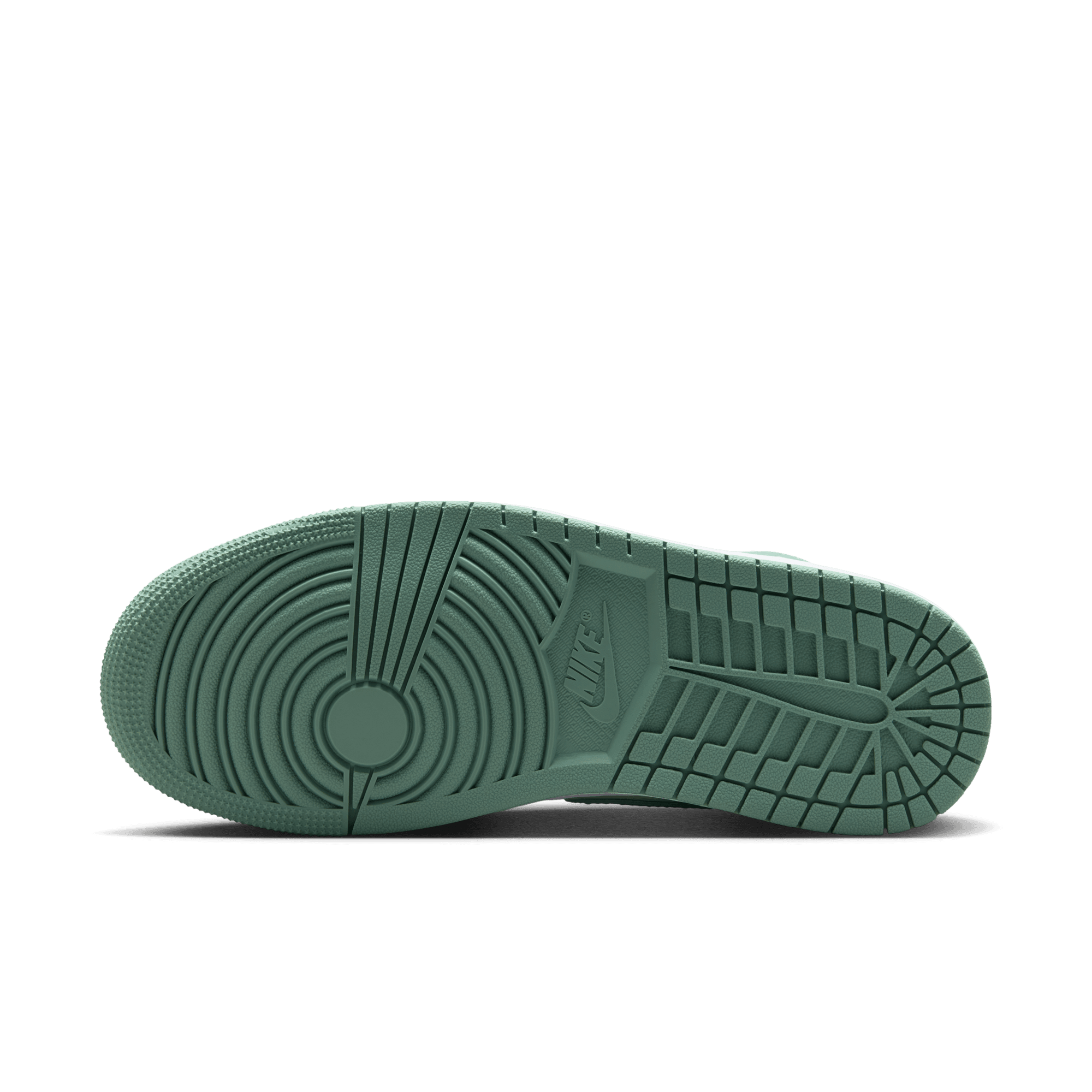 The mid top version of the original Air Jordan embodies everything you love about the Air Jordan 1. This women's version of the classic silhouette features a white leather upper with green leather overlays on the toe and eyestay, ankle and heel. It's accented with a matching green leather swoosh, laces and white lining, with a white Jumpman on the tongue tag and debossed Wings logo. White midsole and a green rubber outsole finishes off the look of this AJ1 Mid.