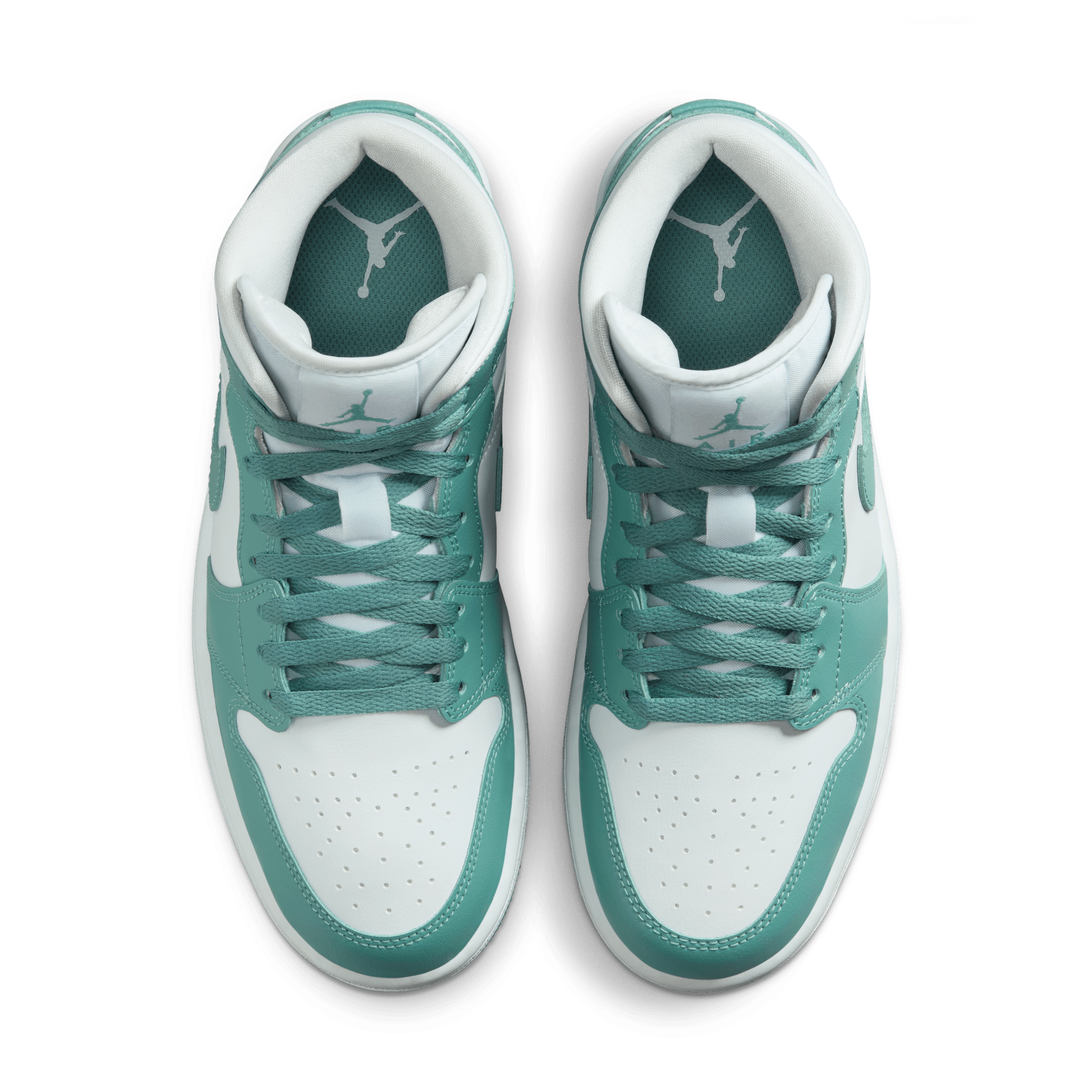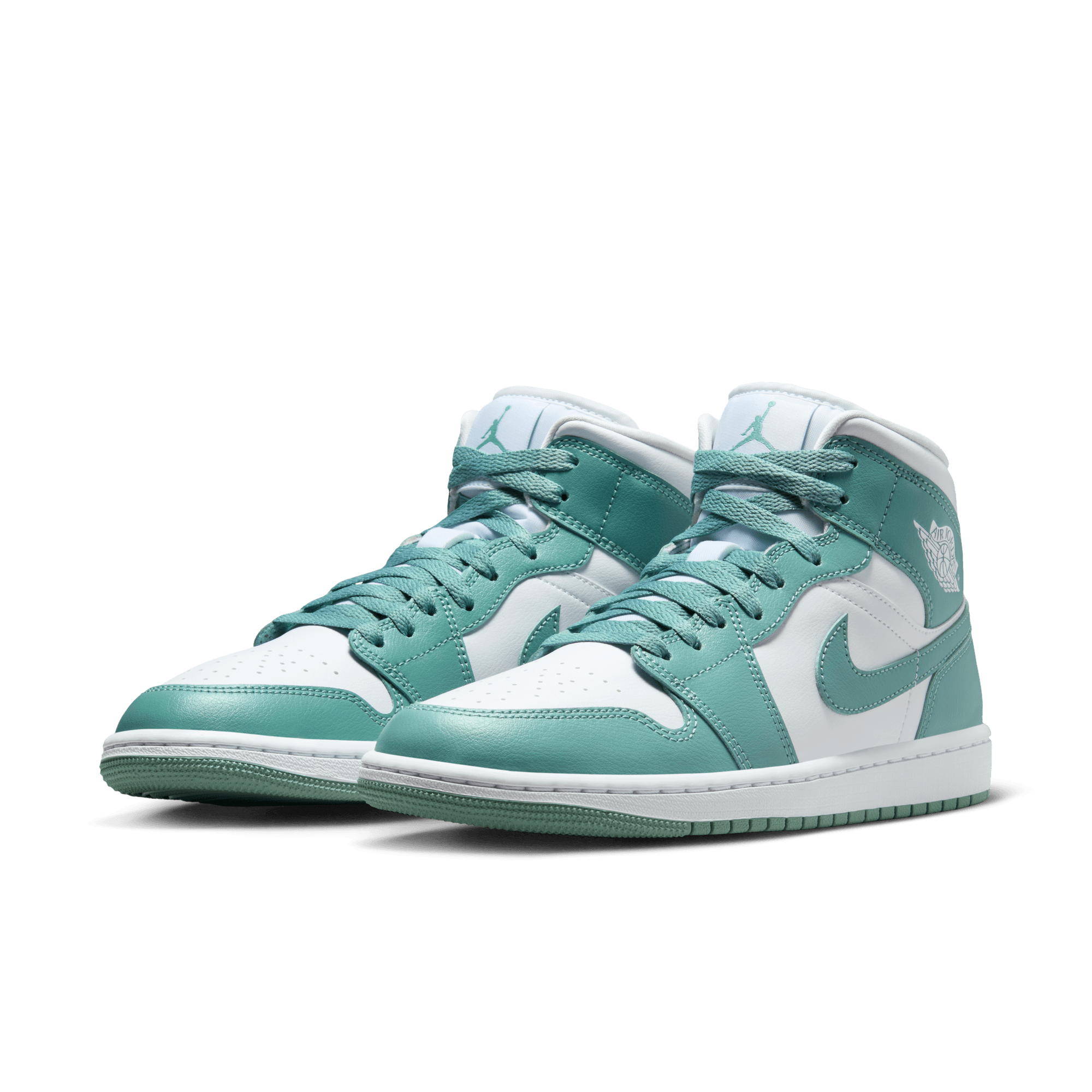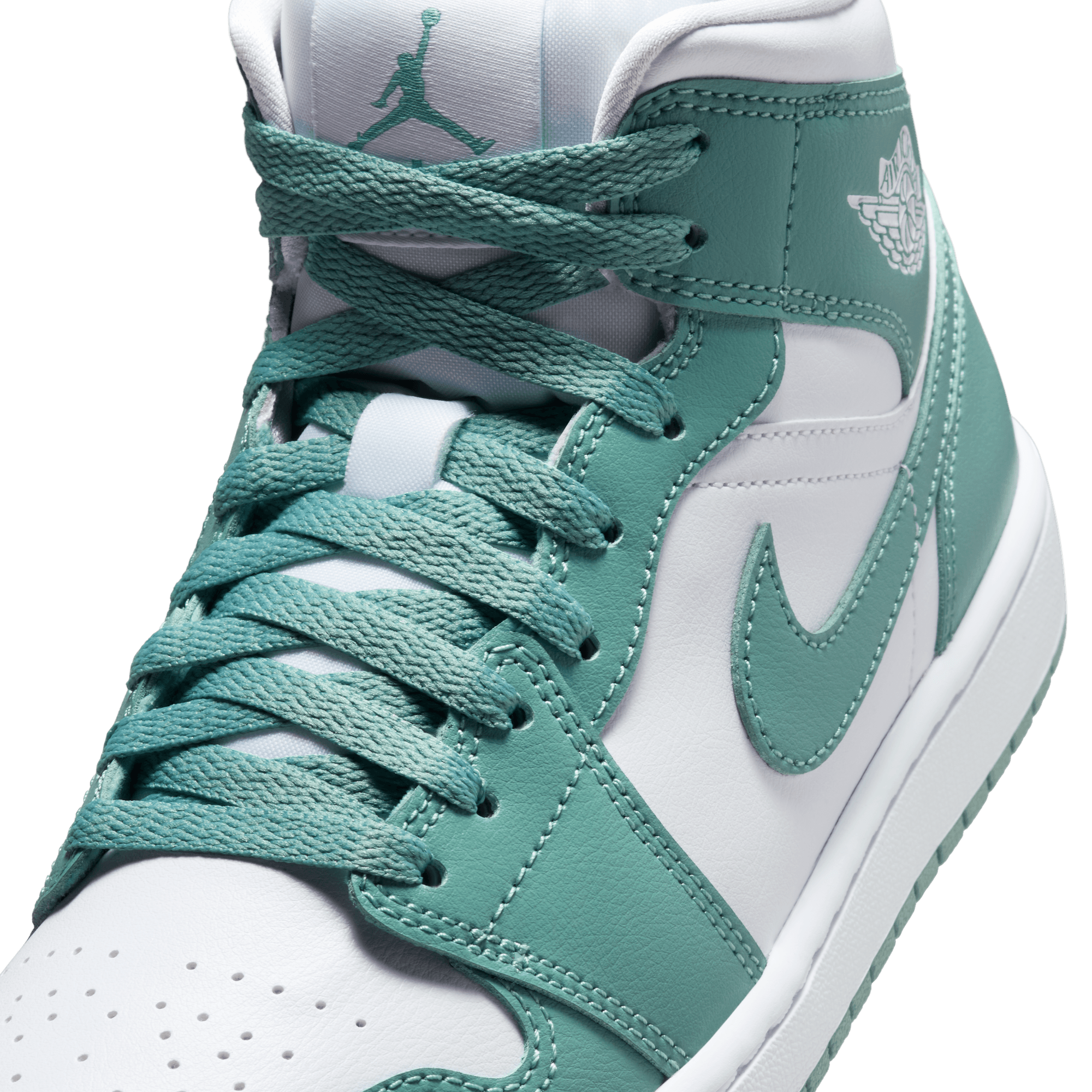 The mid top version of the original Air Jordan embodies everything you love about the Air Jordan 1. This women's version of the classic silhouette features a white leather upper with green leather overlays on the toe and eyestay, ankle and heel. It's accented with a matching green leather swoosh, laces and white lining, with a white Jumpman on the tongue tag and debossed Wings logo. White midsole and a green rubber outsole finishes off the look of this AJ1 Mid.