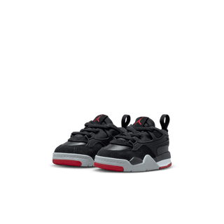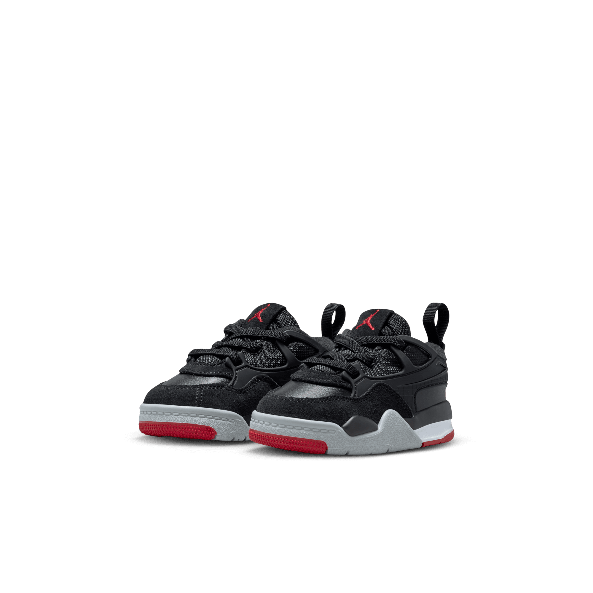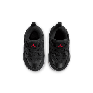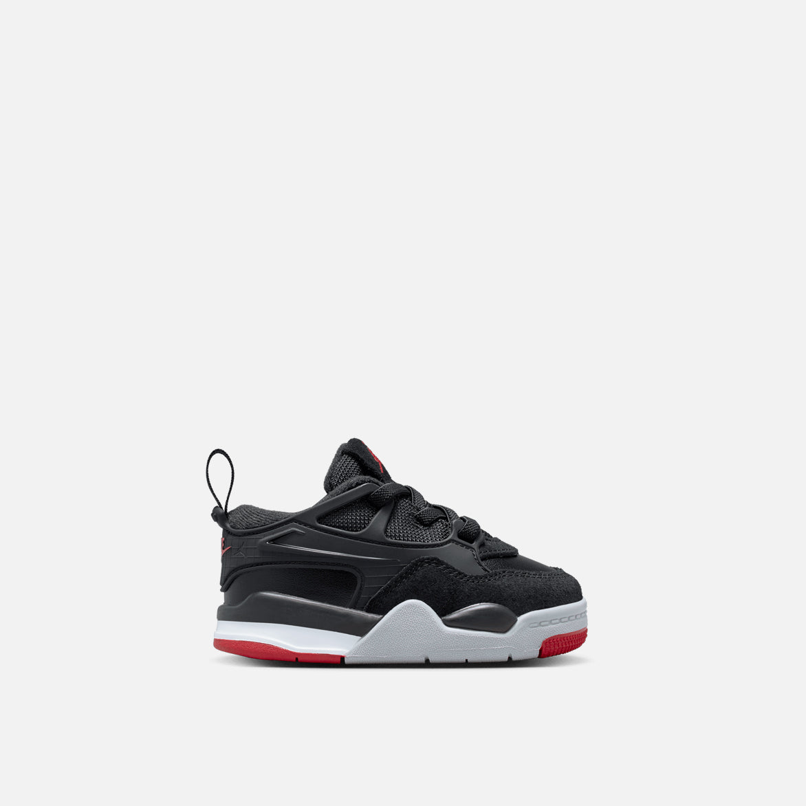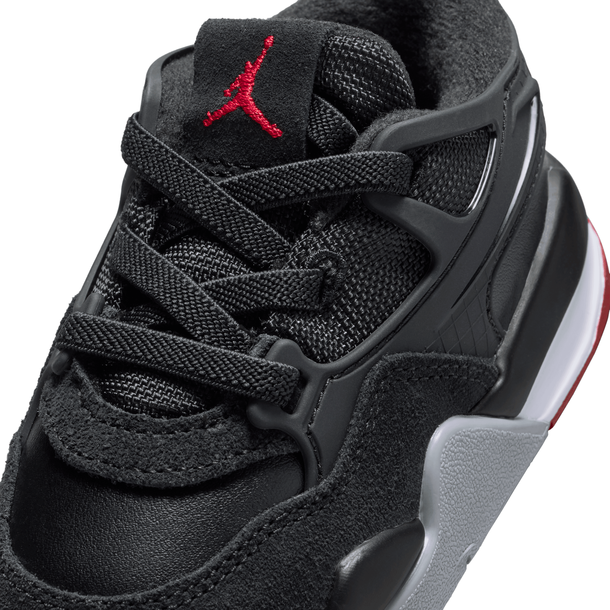 Jordan Brand builds on the legacy of a classic silhouette with a new design that exudes vintage vibes on the Air Jordan 4 RM "Black/Varsity Red". The RM version of the AJ4 remakes the icon with a lower cut on the black leather and suede upper, shrinking the lace wings and getting rid of the signature mesh netting entirely. The mixed material construction continues with a black canvas vamp and an embossed TPU overlay that covers the sides and wraps around the heel. Red accents on the insole, tongue and throwback Nike Air heel branding, black mudguard, white midsole and red rubber outsole complete the design.