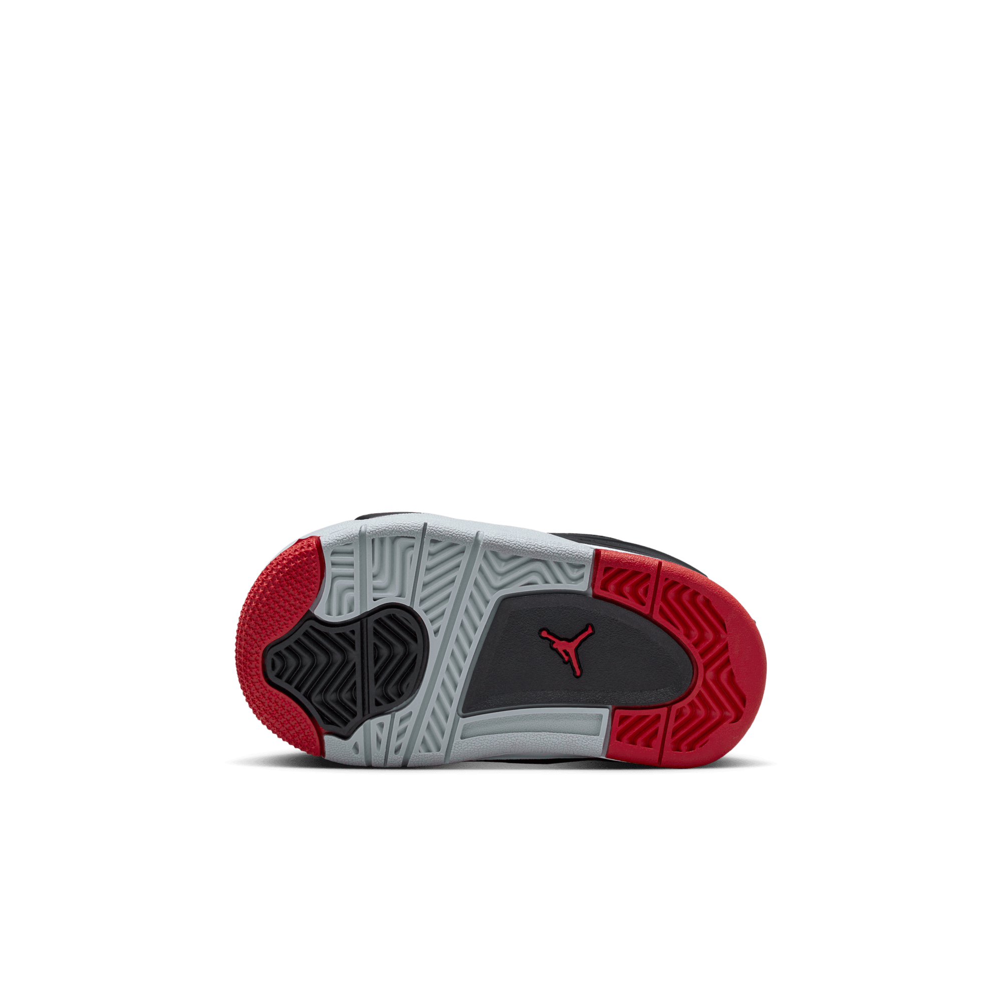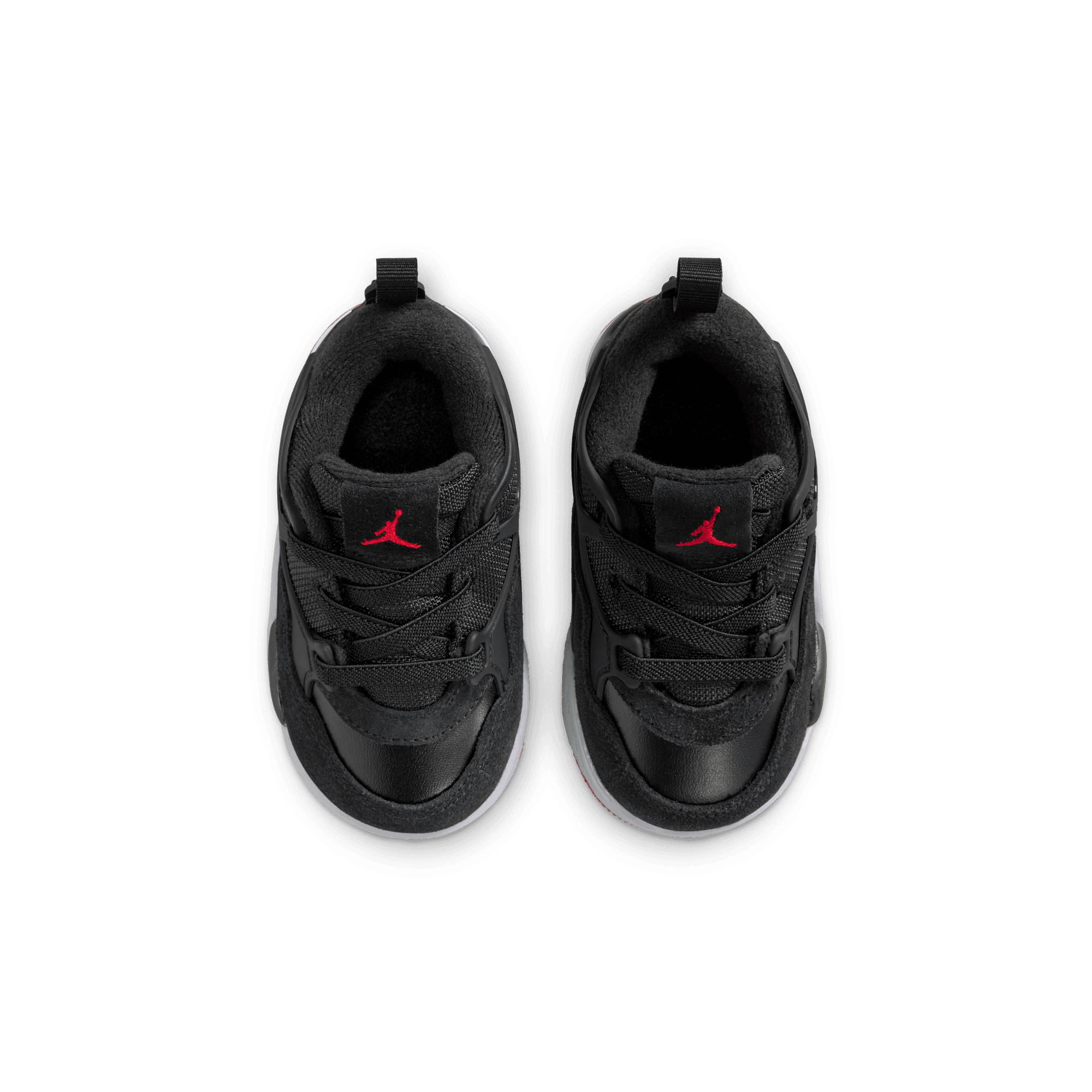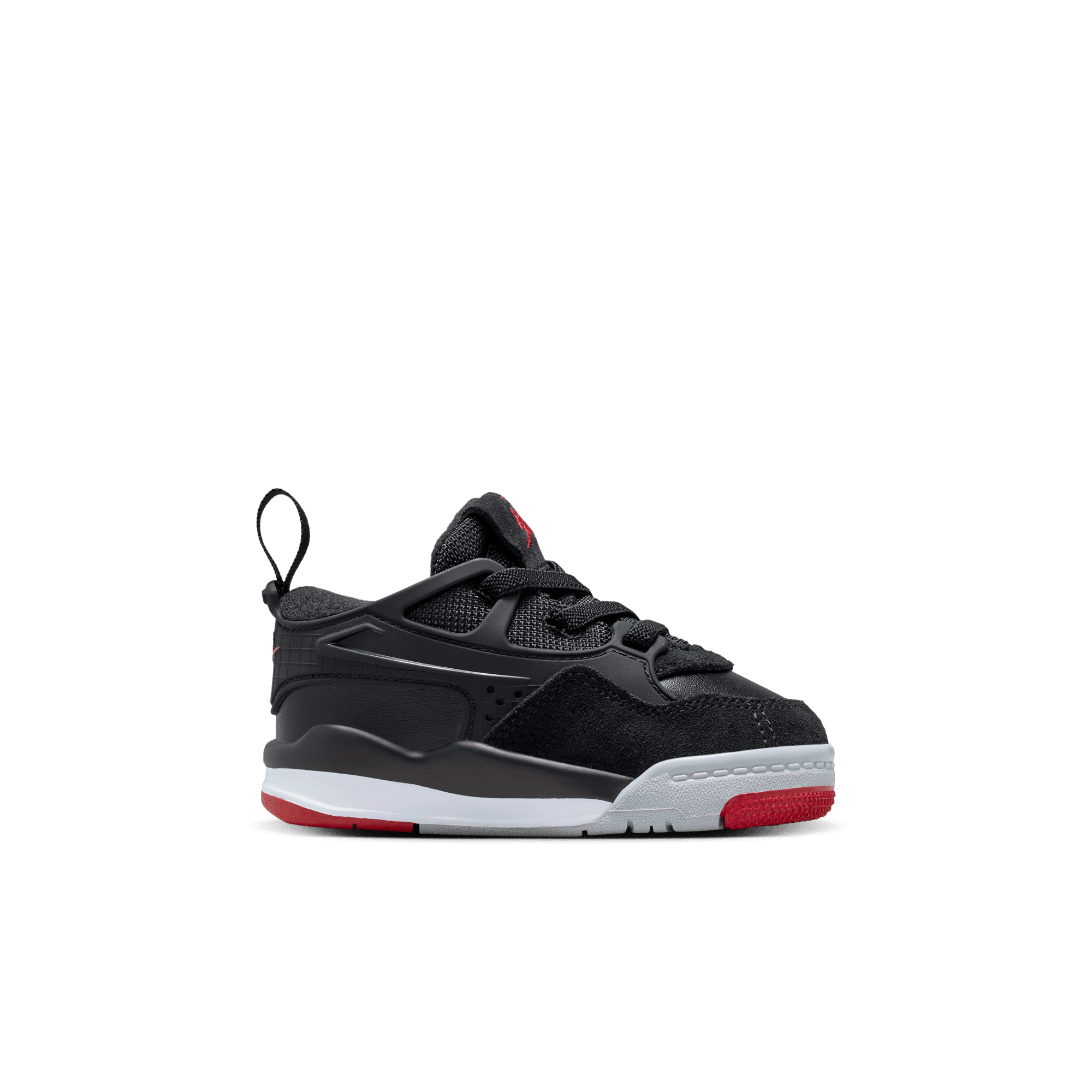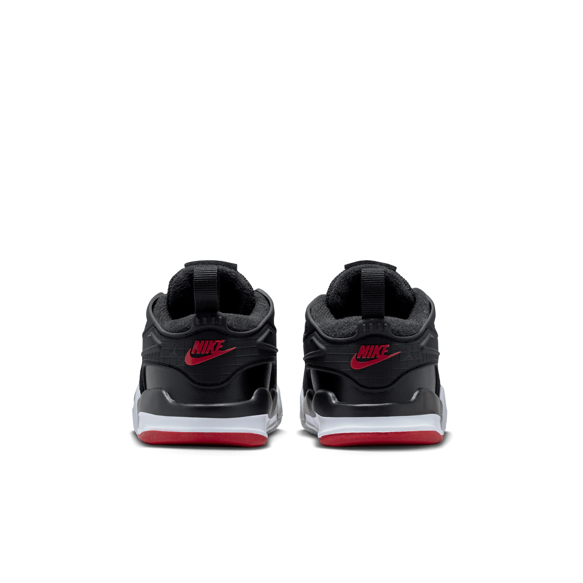 Jordan Brand builds on the legacy of a classic silhouette with a new design that exudes vintage vibes on the Air Jordan 4 RM "Black/Varsity Red". The RM version of the AJ4 remakes the icon with a lower cut on the black leather and suede upper, shrinking the lace wings and getting rid of the signature mesh netting entirely. The mixed material construction continues with a black canvas vamp and an embossed TPU overlay that covers the sides and wraps around the heel. Red accents on the insole, tongue and throwback Nike Air heel branding, black mudguard, white midsole and red rubber outsole complete the design.