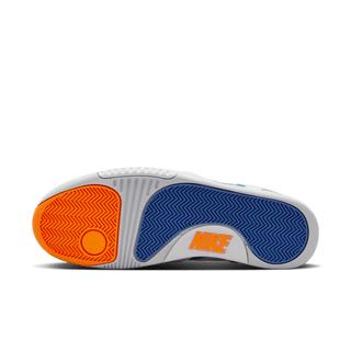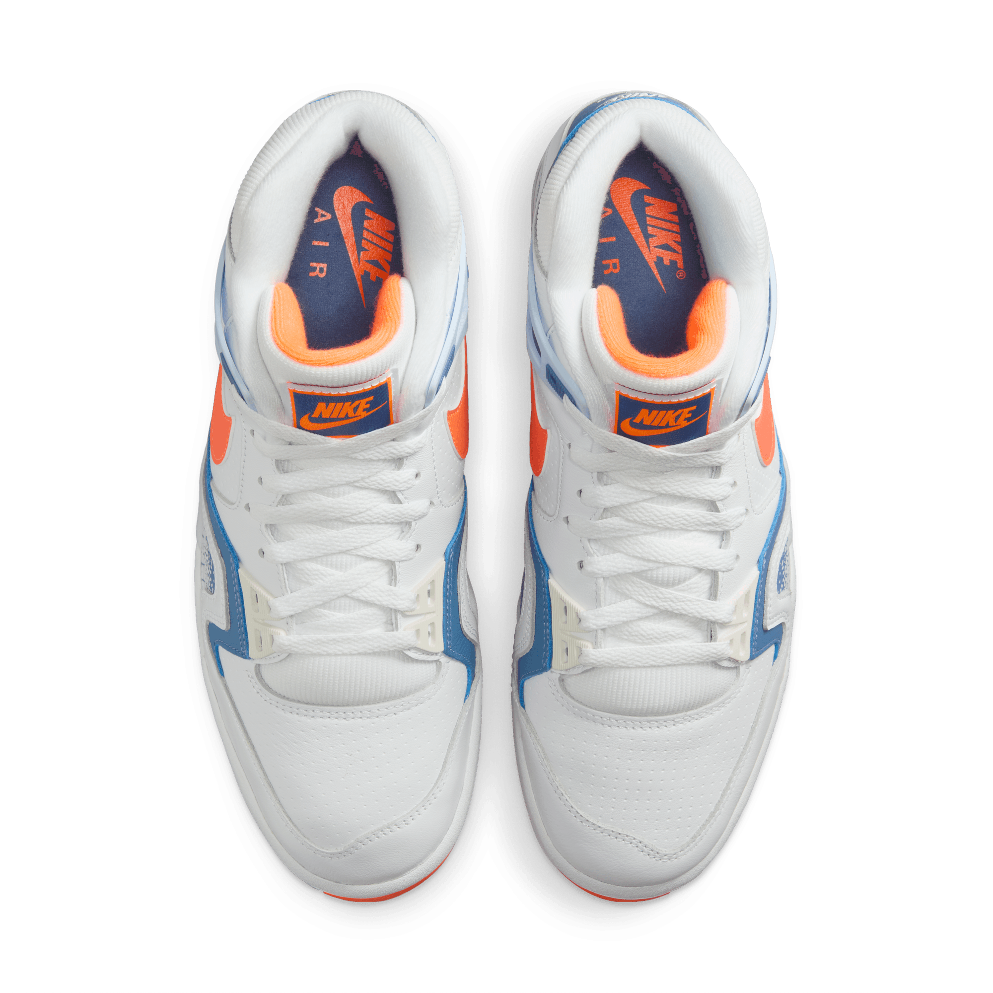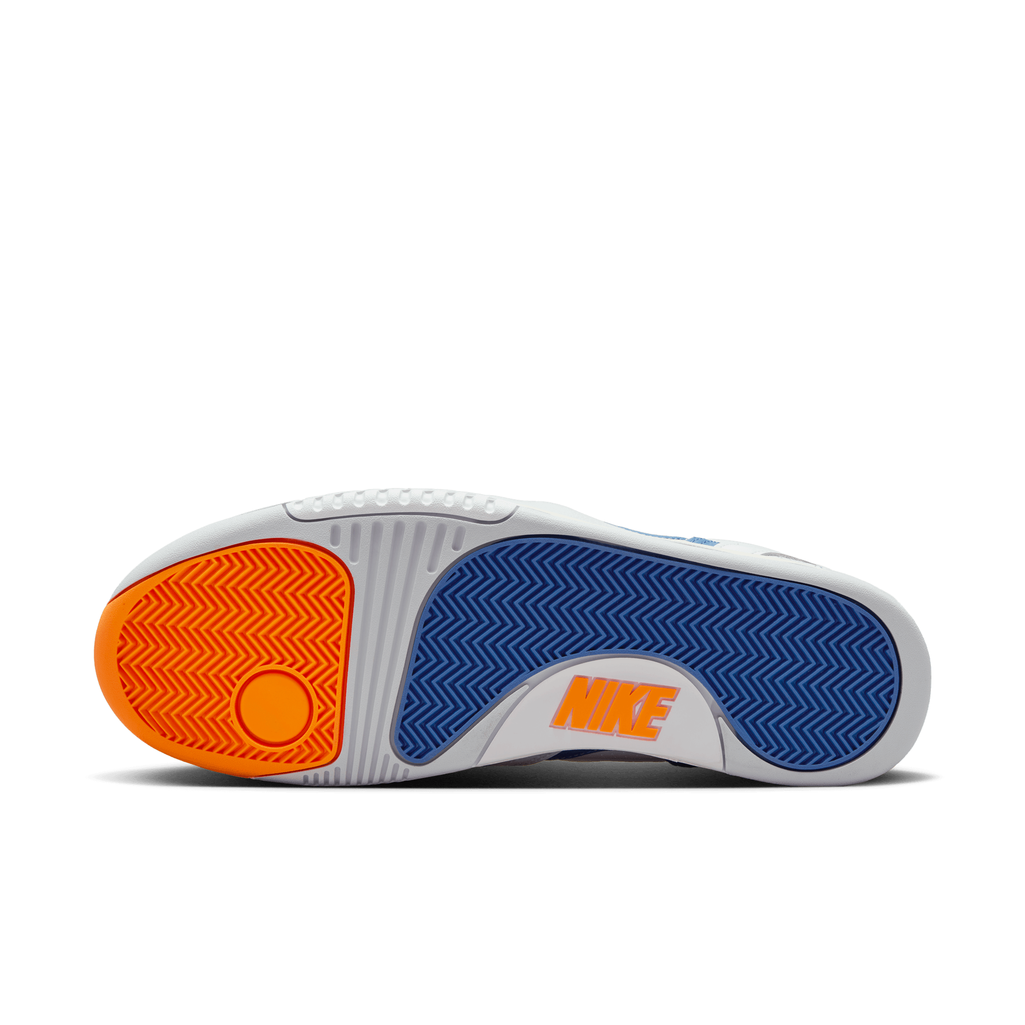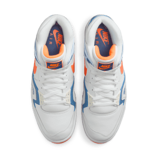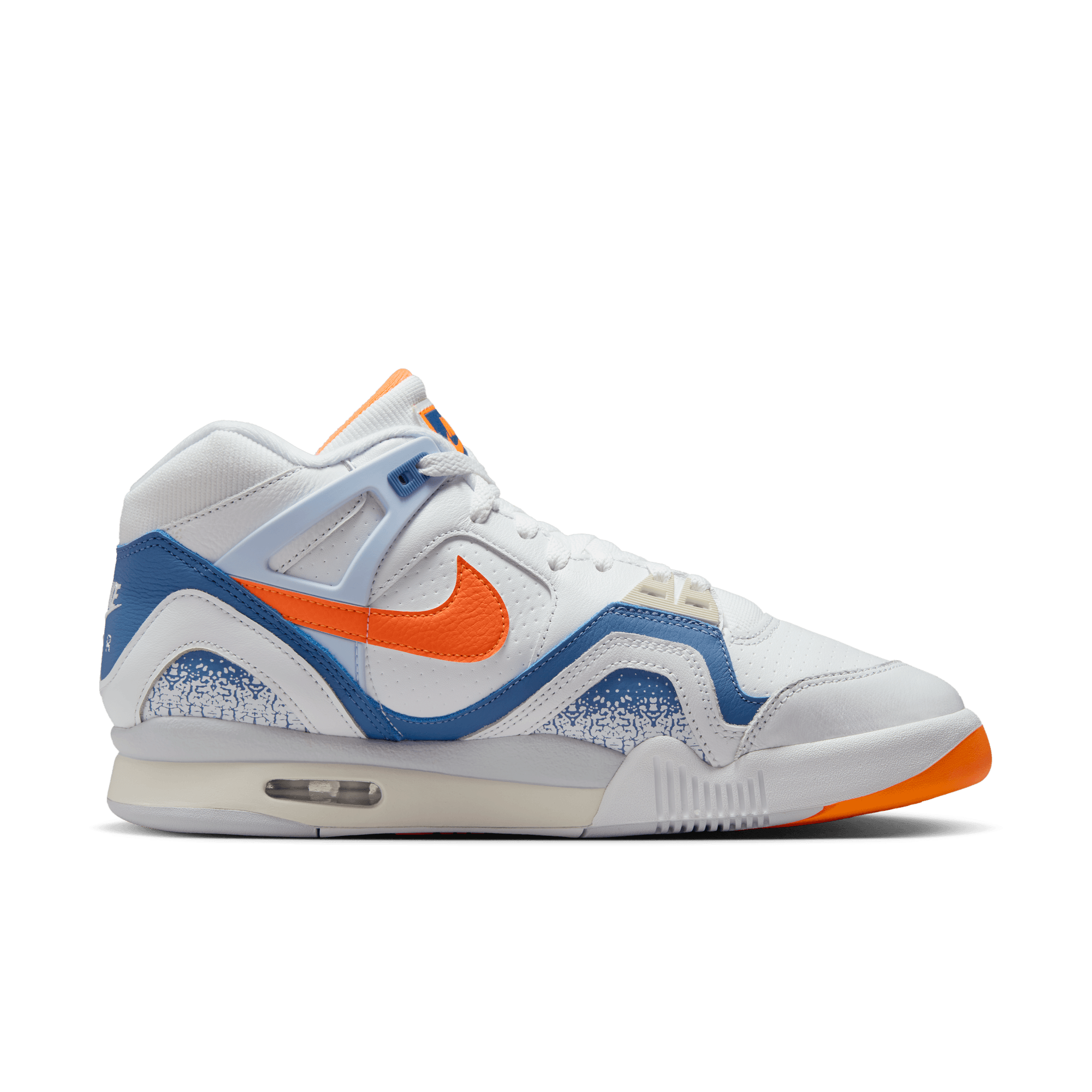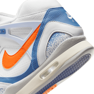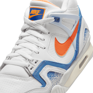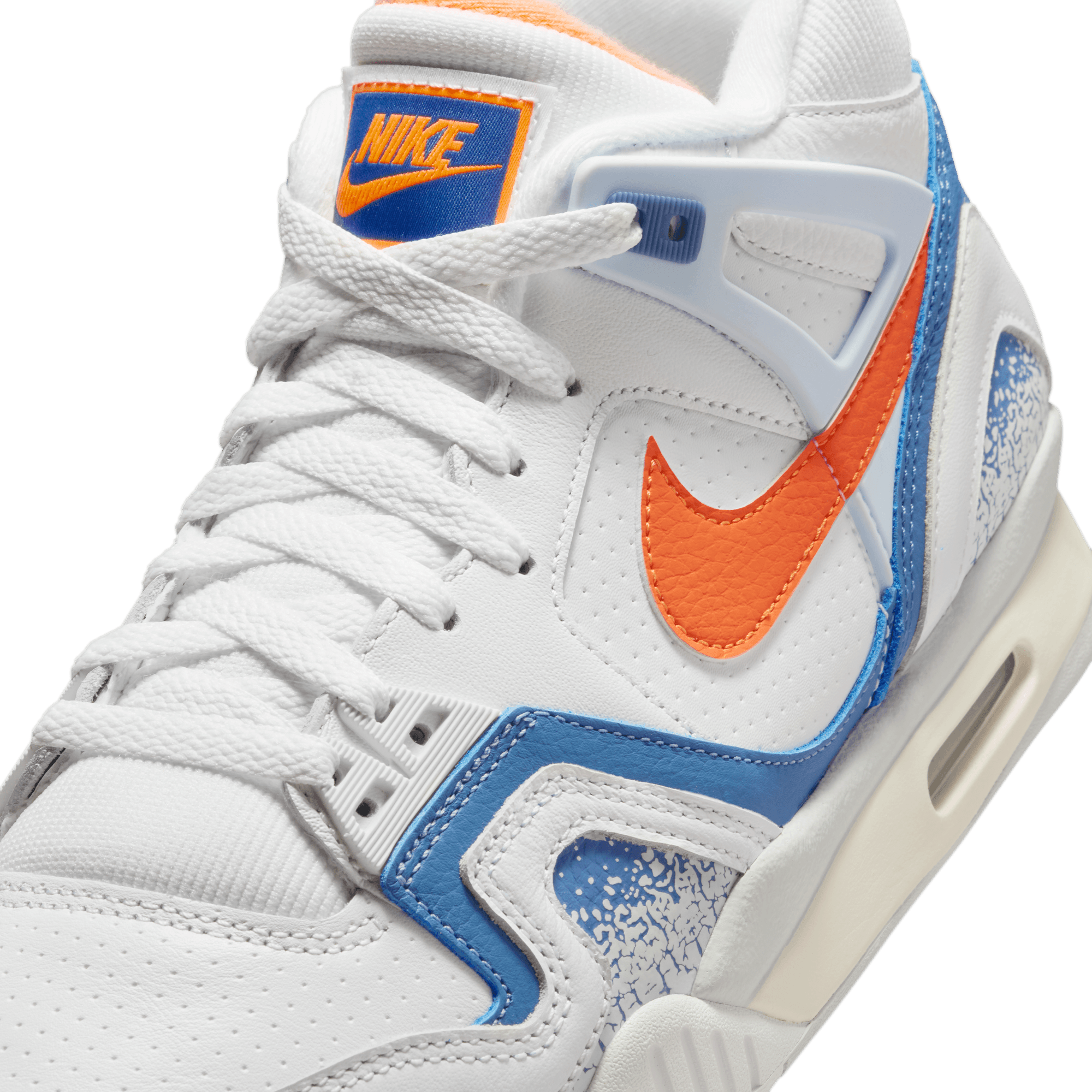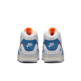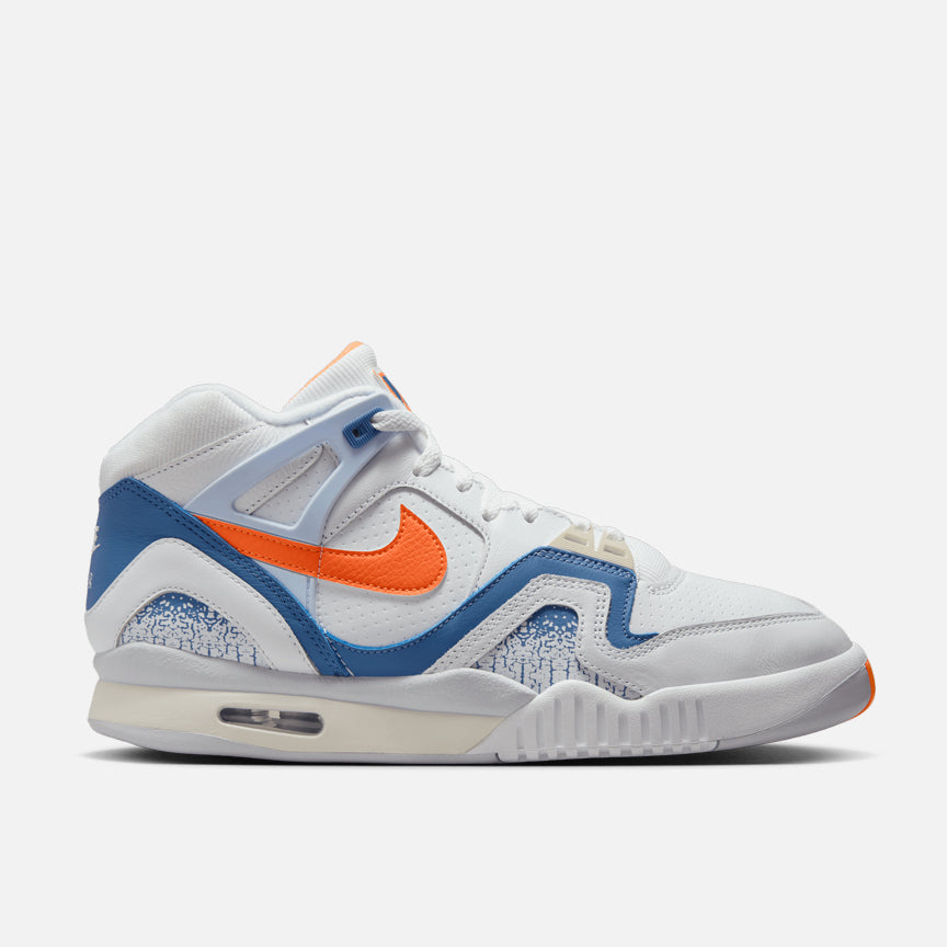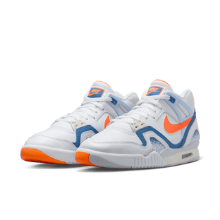 The most famous signature silhouette of Andre Agassi, tennis' favorite rebel, is back in all its audacious glory with the Air Tech Challenge 2 "Tart/Stone Blue". The iconic '90s court classic nods to the Knicks with this new colorway, as orange accents the white leather upper on the swoosh, lining and branding with a blue overlay wrapping around sides and heel and coloring the bubbly detailing above the grey mudguard. Grey also hits the TPU lace wings, while a white midsole, and a grey, blue and orange rubber outsole finishes off the look.