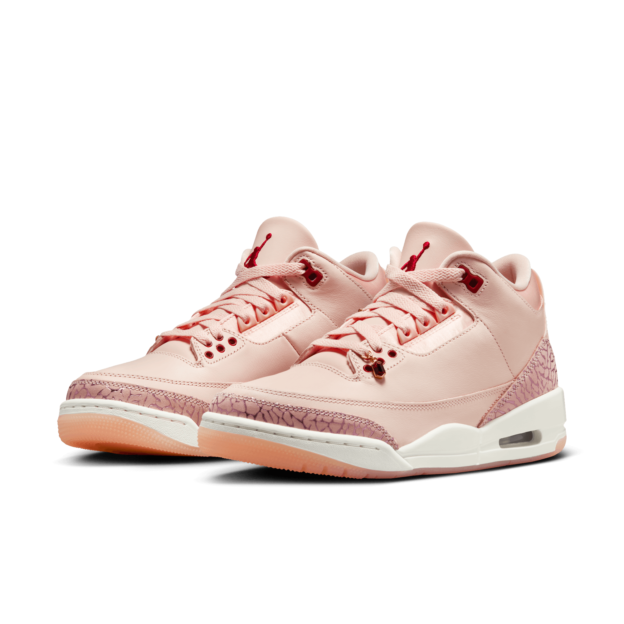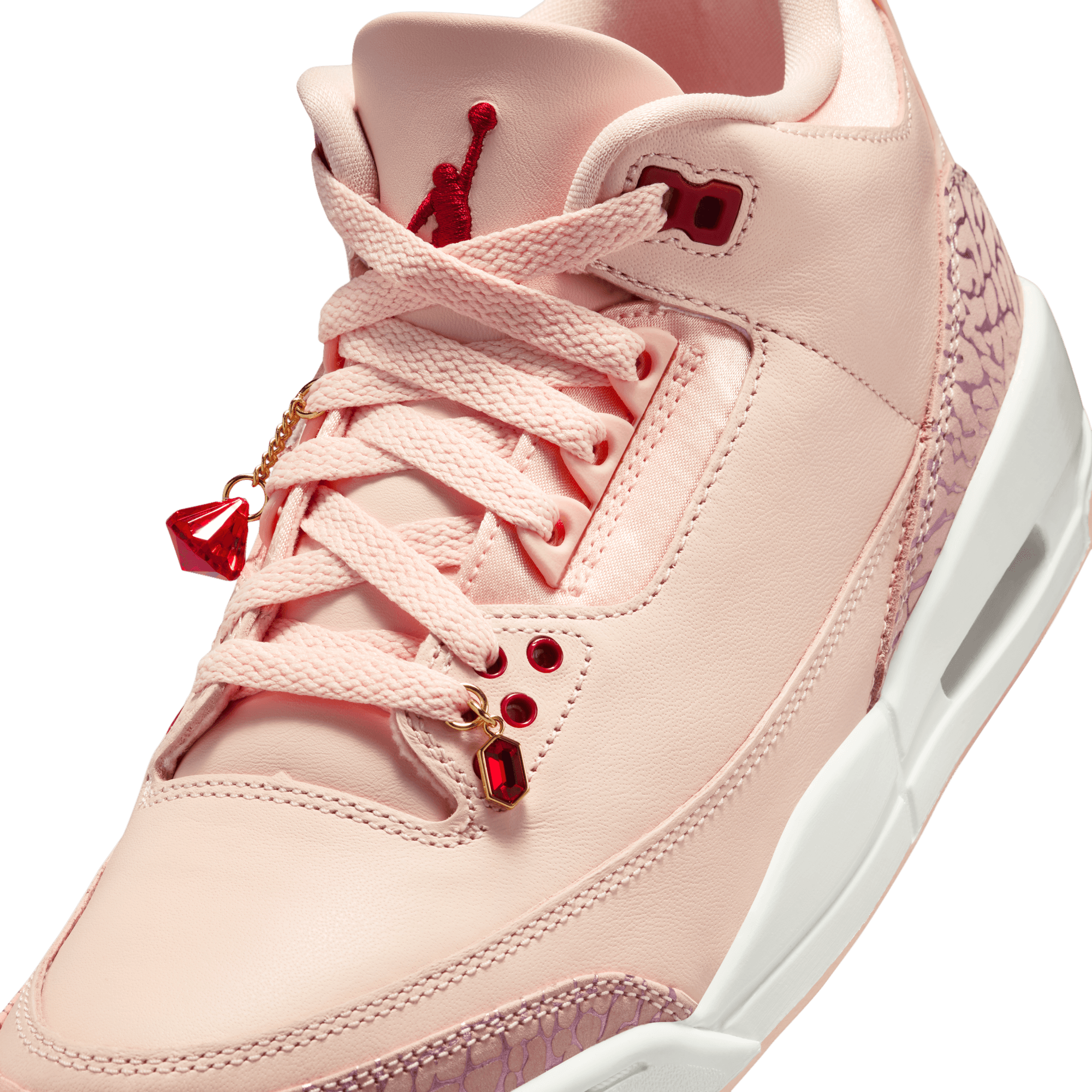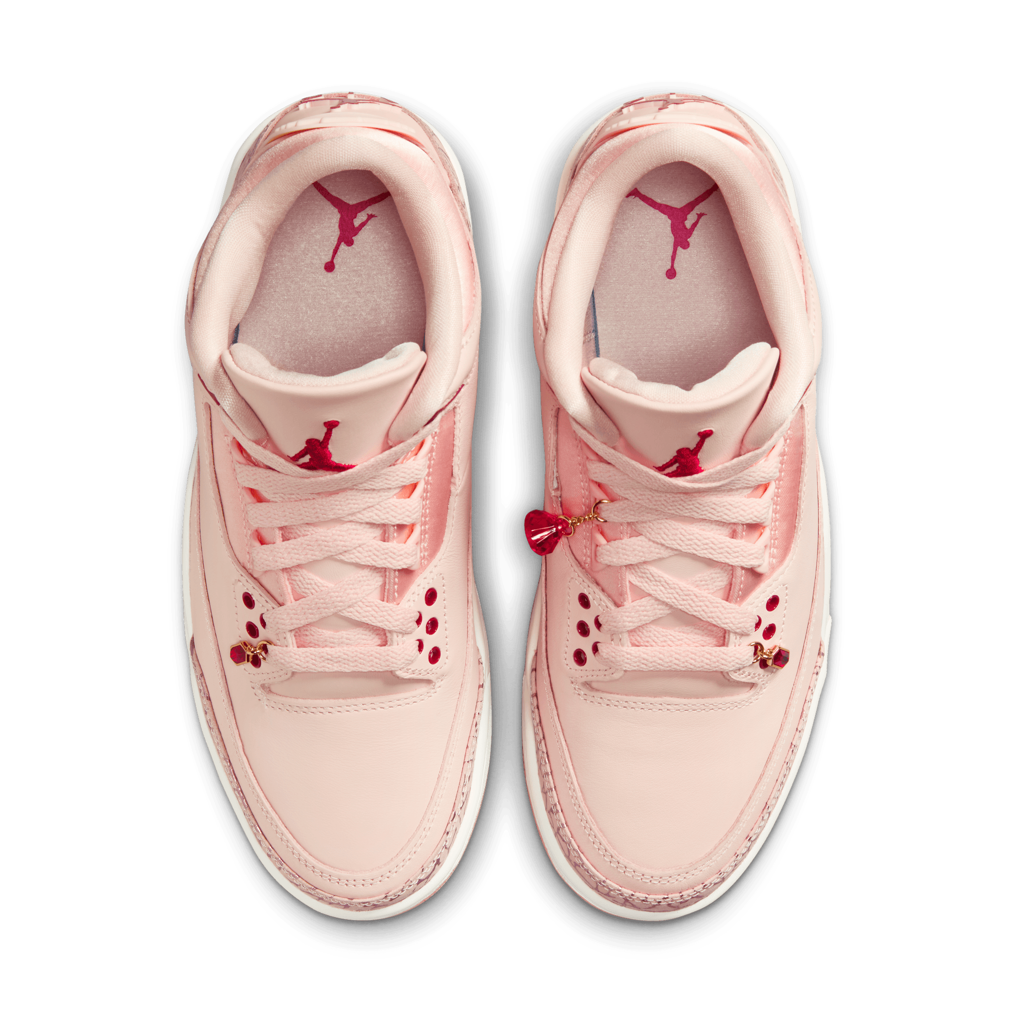 Jordan Brand brings all the charm and romance of Valentine's Day to its latest women's exclusive on the WMNS Air Jordan 3 Retro "Treat Yourself". The iconic silhouette is built from a soft pink leather upper with dark pink elephant print overlays on the toe and heel that feature pink metallic detailing. Red branding hits the tongue and heel, with gold and garnet-like charms hanging from the pink laces being the standout feature. A white midsole and semi-translucent pink outsole finish off this holiday-themed release.