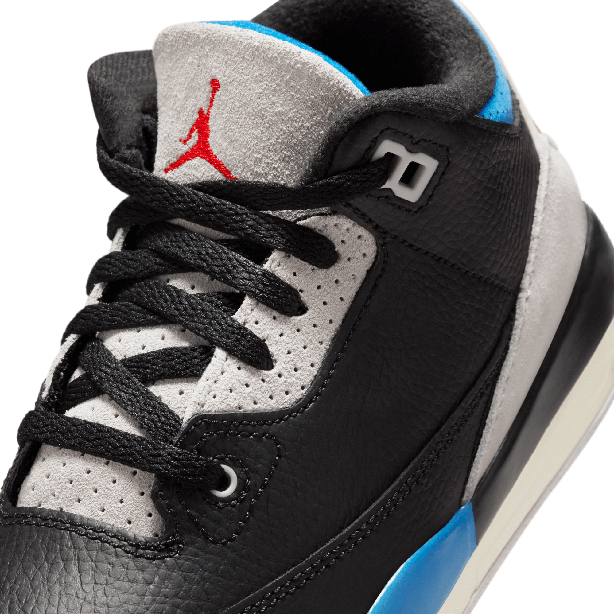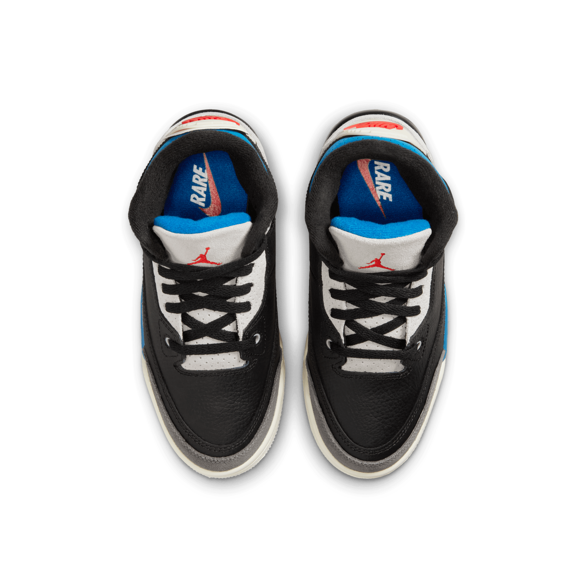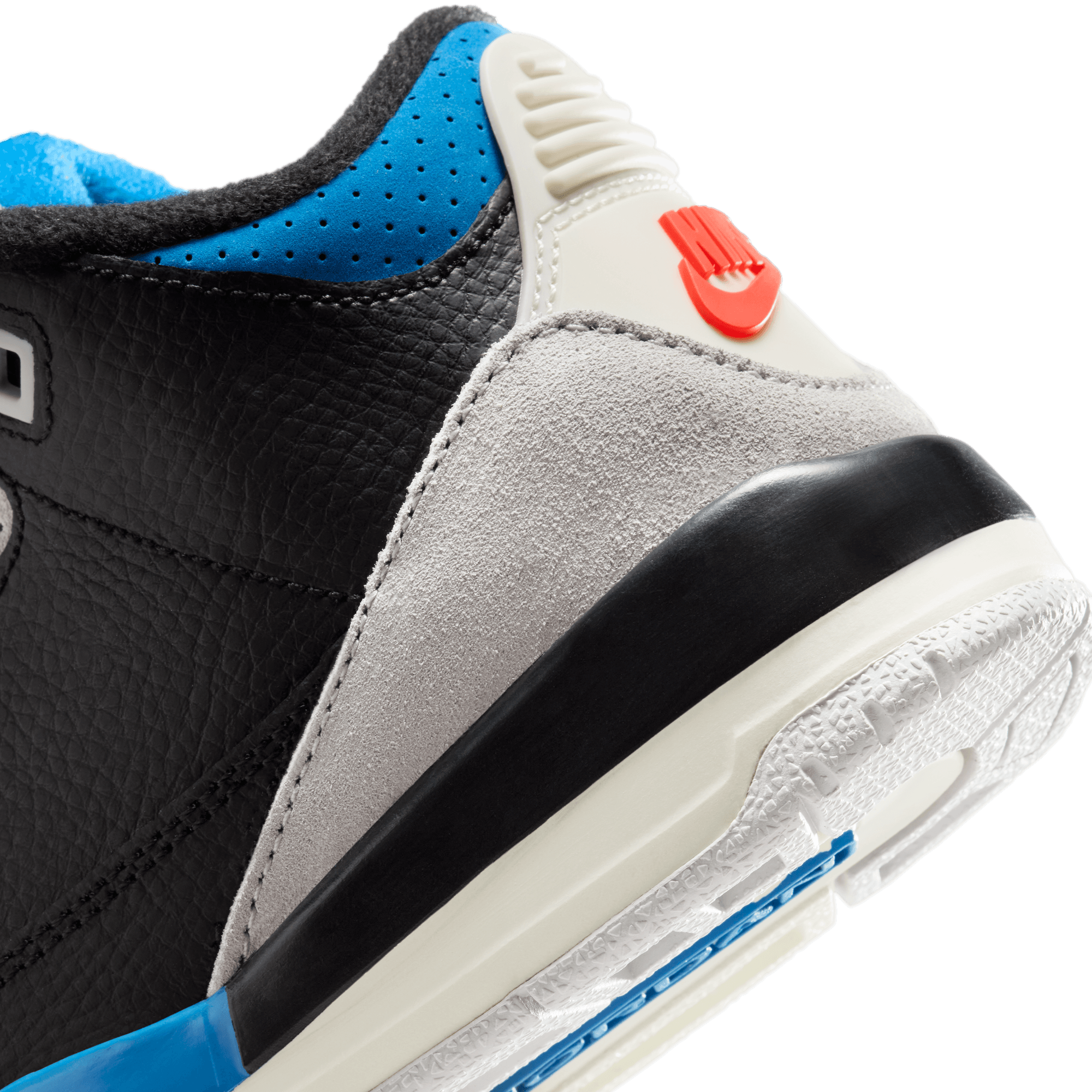 Jordan Brand shifts their Rare Air concept from the original Air Jordan to another iconic early model on the Air Jordan 3 Retro OG "Rare Air". Drawing inspiration from the "mistakes," imperfections and experimentation of sample pairs, this edition of "Rare Air" contains unique, one-off details like grey suede overlays on the toe and heel in place of the standard elephant print, and a backwards Nike Air logo on the right heel in a reflection of the left heel branding. The rest of the build sees a black leather upper accented with blue pref leather on the collar, blue and black mudguard, off white midsole and grey rubber outsole.