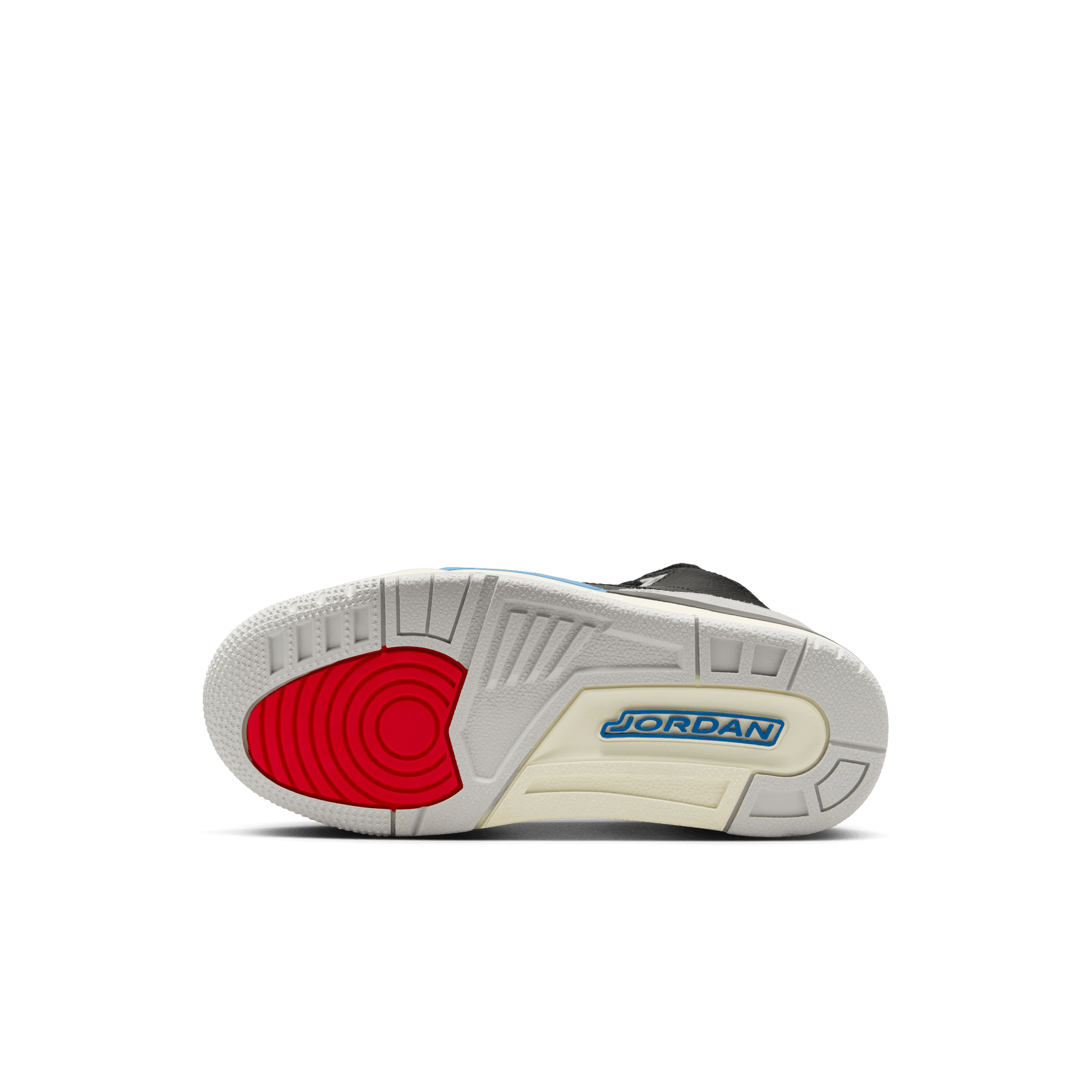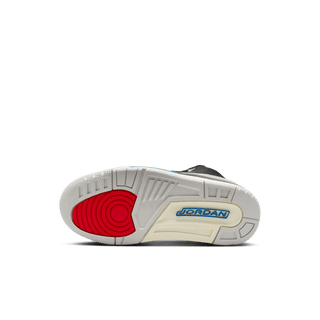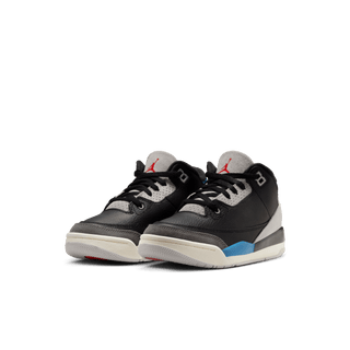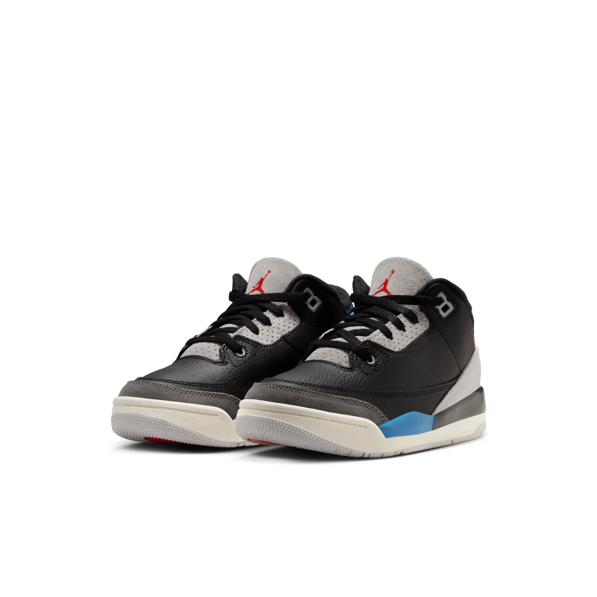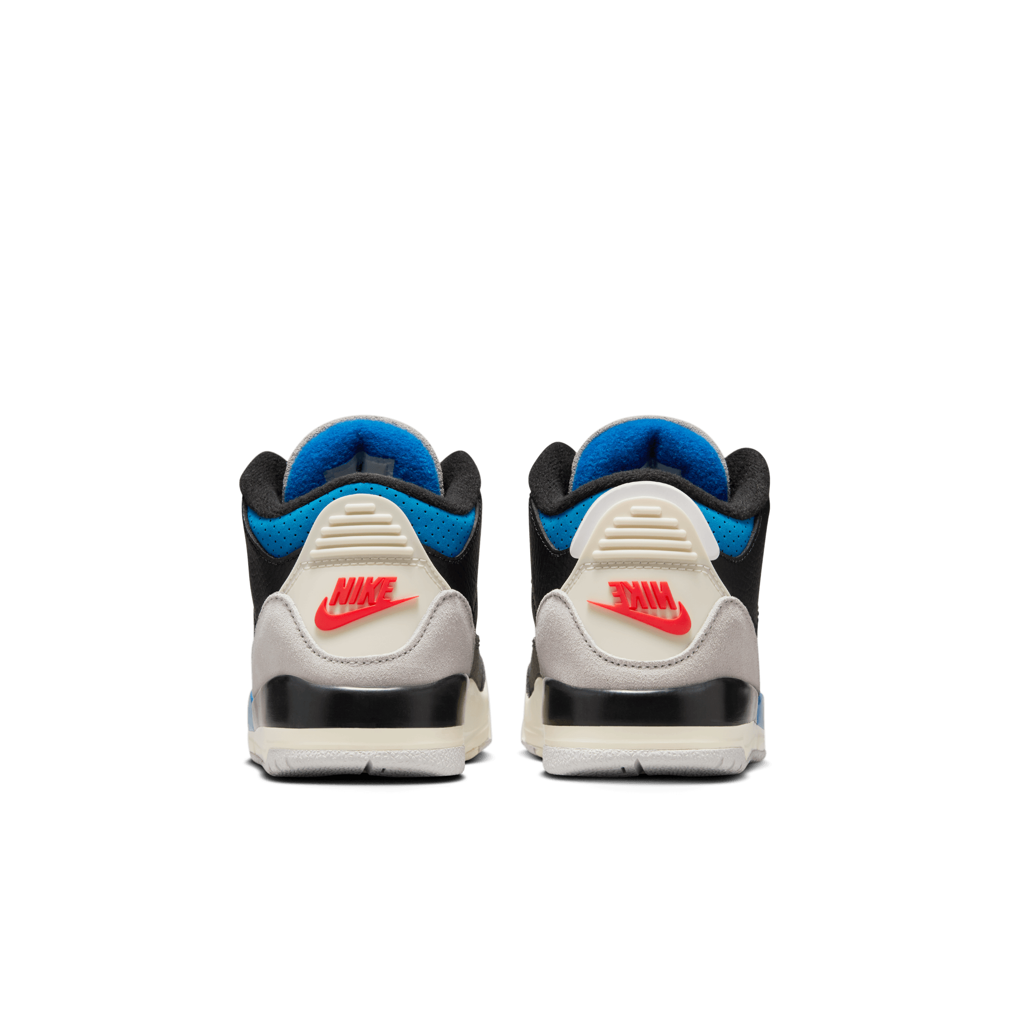 Jordan Brand shifts their Rare Air concept from the original Air Jordan to another iconic early model on the Air Jordan 3 Retro OG "Rare Air". Drawing inspiration from the "mistakes," imperfections and experimentation of sample pairs, this edition of "Rare Air" contains unique, one-off details like grey suede overlays on the toe and heel in place of the standard elephant print, and a backwards Nike Air logo on the right heel in a reflection of the left heel branding. The rest of the build sees a black leather upper accented with blue pref leather on the collar, blue and black mudguard, off white midsole and grey rubber outsole.
