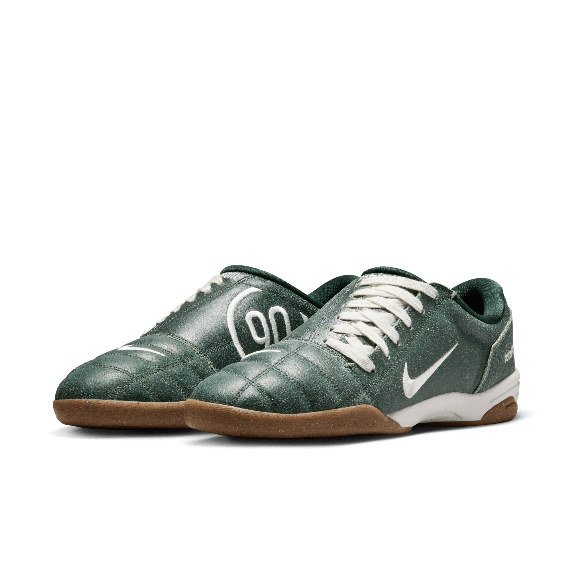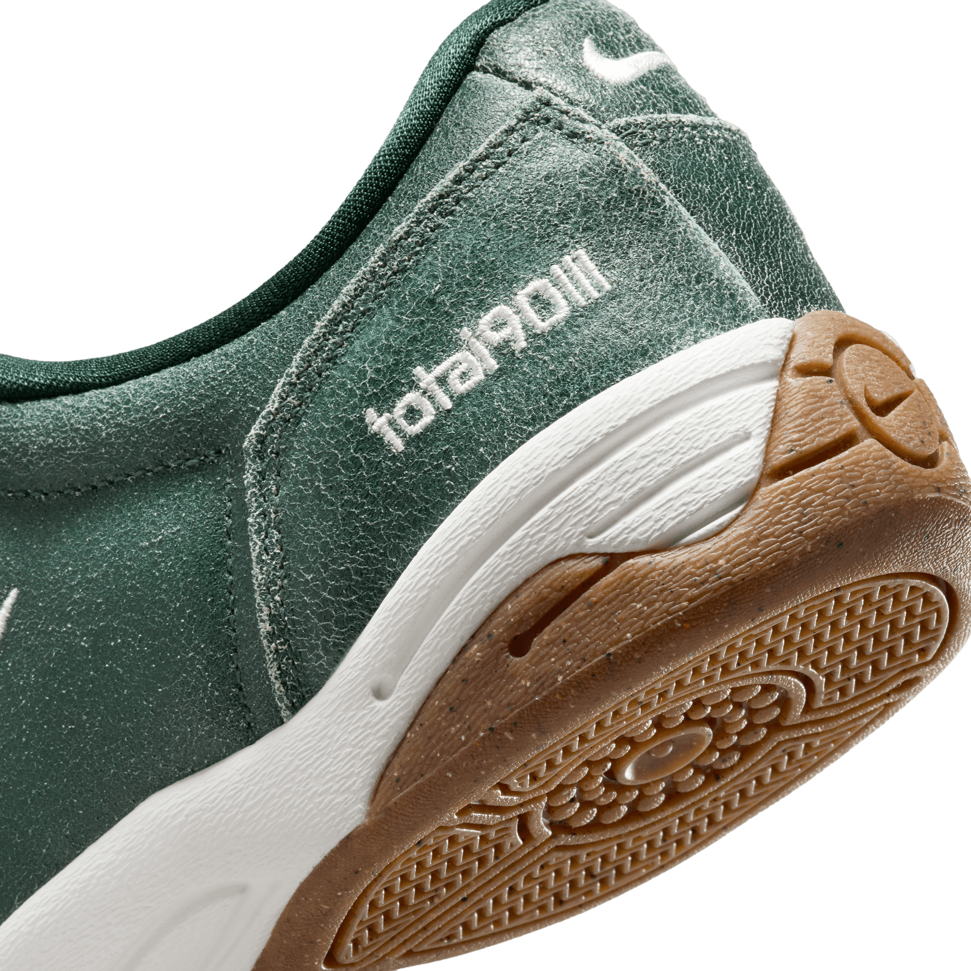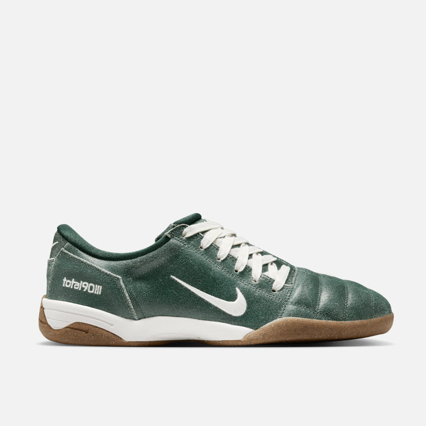 Nike remakes a Y2K soccer superstar into a lifestyle option with the Total 90 SP "Pearl White/Shadow Brown". Born on the pitch in 2000, the Total 90 left a lasting legacy on the beautiful game. Now it's back and ready for the street with authentic soccer style, reloaded for today. This modern edition swaps out the cleats for a flat, gum rubber sole but keeps the iconic quilted upper and asymmetrical lacing of the original. An aged and cracked dark green finish on the leather upper highlights white below the surface, while while embroidered branding, stitch detail and laces finishes off the look.
