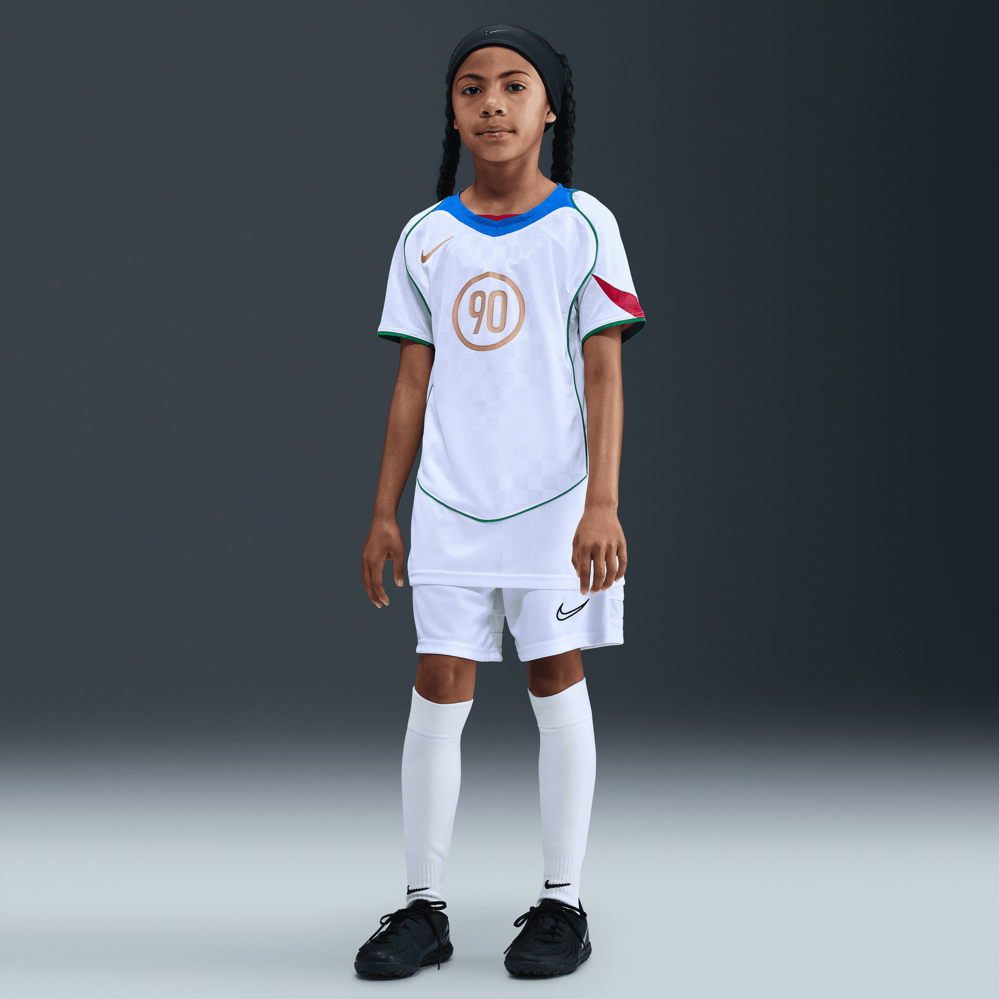 Channeling the energy of the early-2000s, this Total 90 jersey is a throwback to the kits worn by some of the era's biggest clubs and national teams. Designed to perform through all 90 minutes of a match, the collection became one of the iconic kits of the 2000s thanks to its curving lines, asymmetric designs and mixed materials. This rerelease brings that same energy for a new generation of players and fans with updates like sweat-wicking Dri-FIT technology to the ultra-breathable, 100% polyester construction; combining soft knit fabric with mesh paneling on the side, sleeves and back panels.