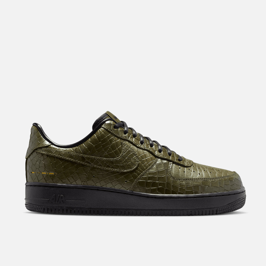 You can never go wrong with reptile skin AF1, a fact that is proven once again with the Air Force 1 '07 PRM "Cargo Khaki Croc". Combining two classic footwear looks - Forces and gators - the nearly monochrome construction sees an army green leather upper covered in allover crocodile skin embossing with tonal overlays, tonal woven tongue tag, and black laces and lining. Nike branding appears in yellow morse code on the heel and insole as a subtle color pop, while a black sole unit completes the design.