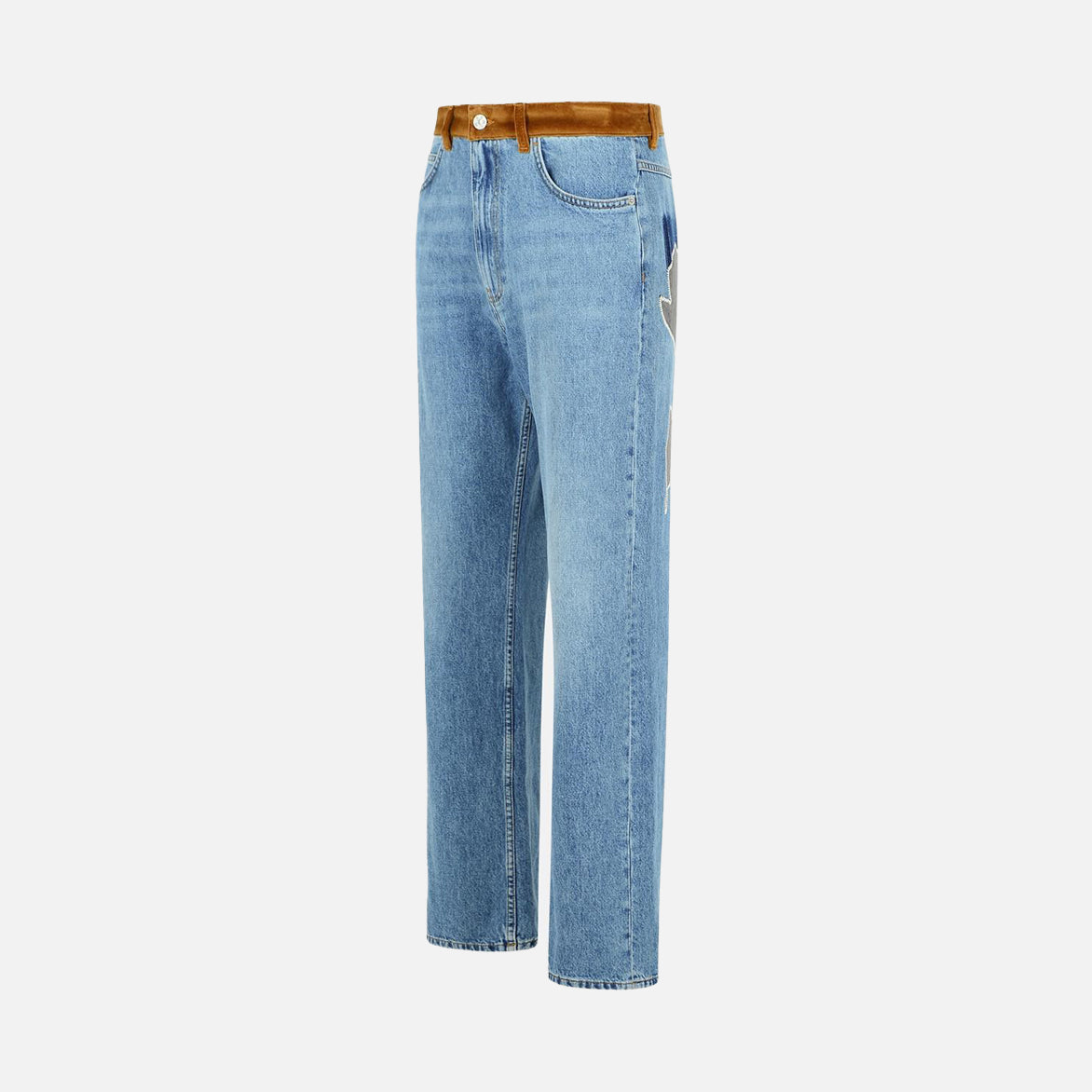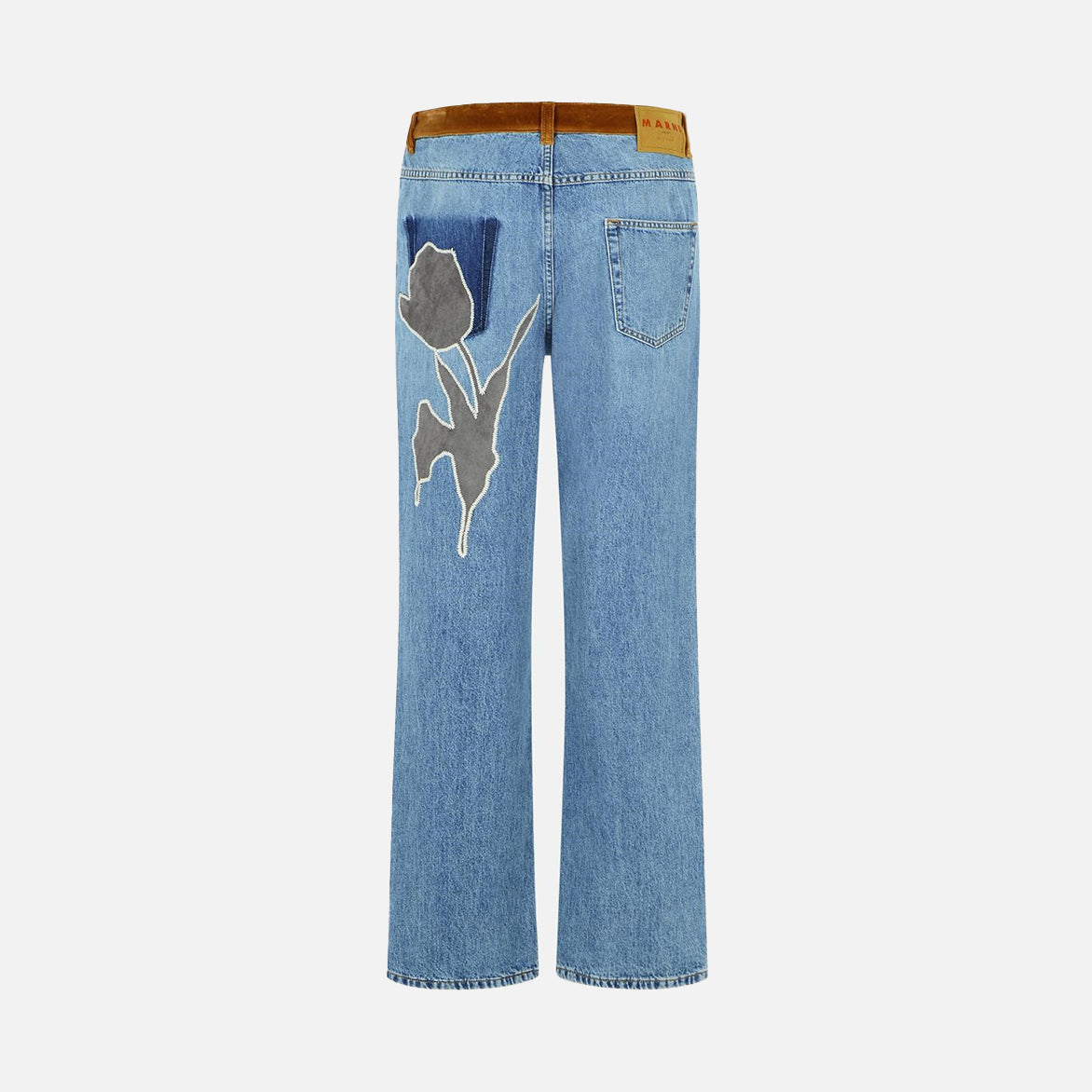Italian luxury brand, Marni, presents these 100% cotton mid-rise trousers made from washed bull denim. Classic 5-pocket silhouette with wide-leg fit and regular velvet waist. Zipper-and-button fly. Finished with Marni logo label and back floral decoration patch.