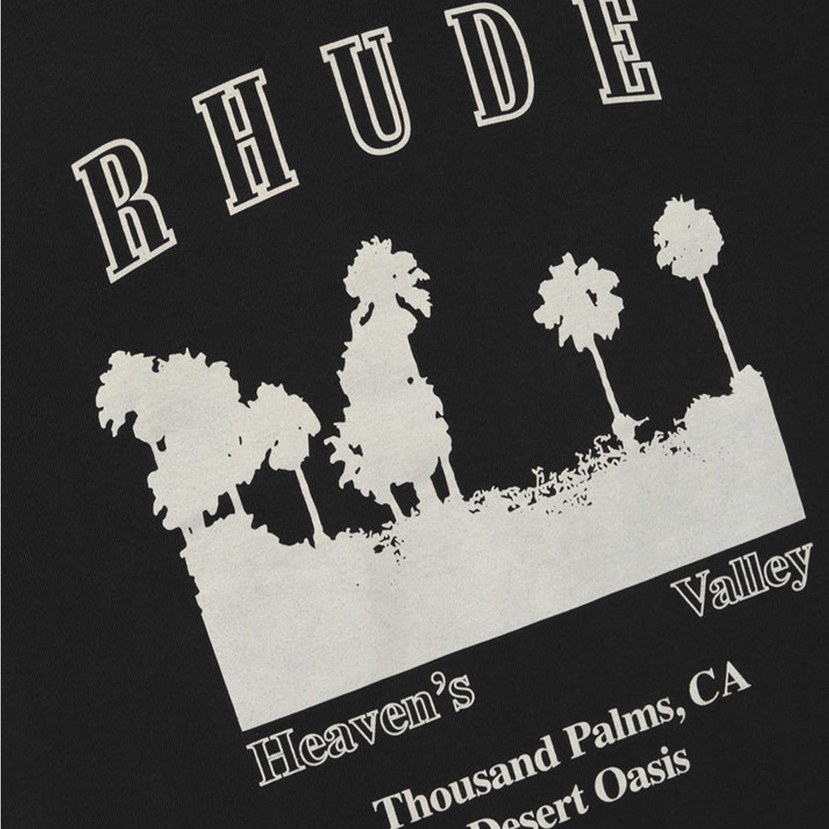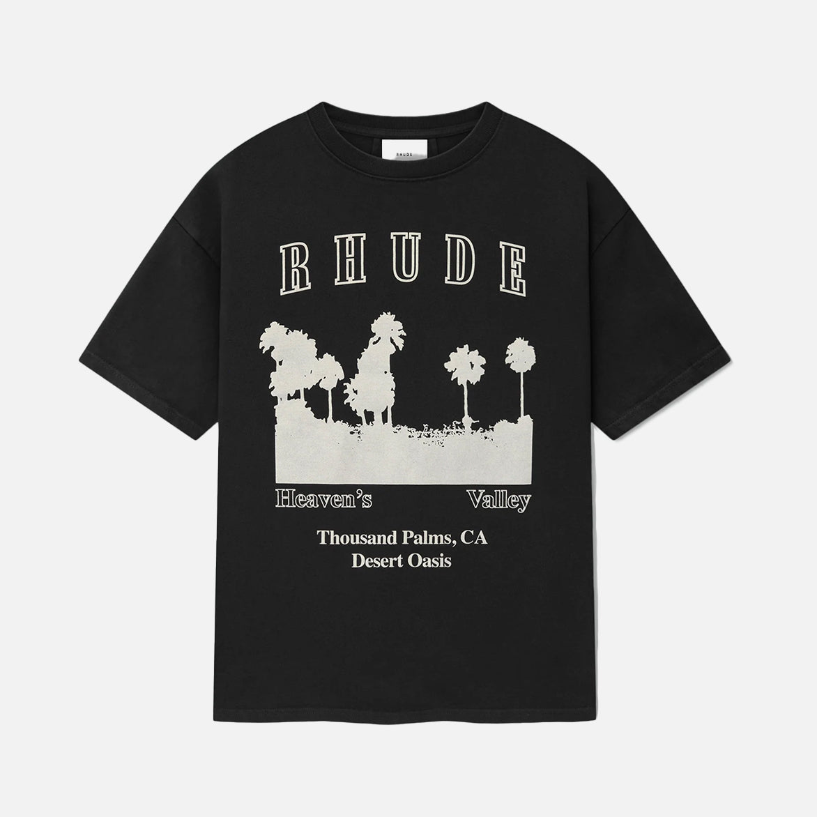 Custom-fit vintage wash cotton short sleeve tee-shirt with Rhude "Thousand Palms, CA, desert oasis" designs printed on the front, with a clean back.