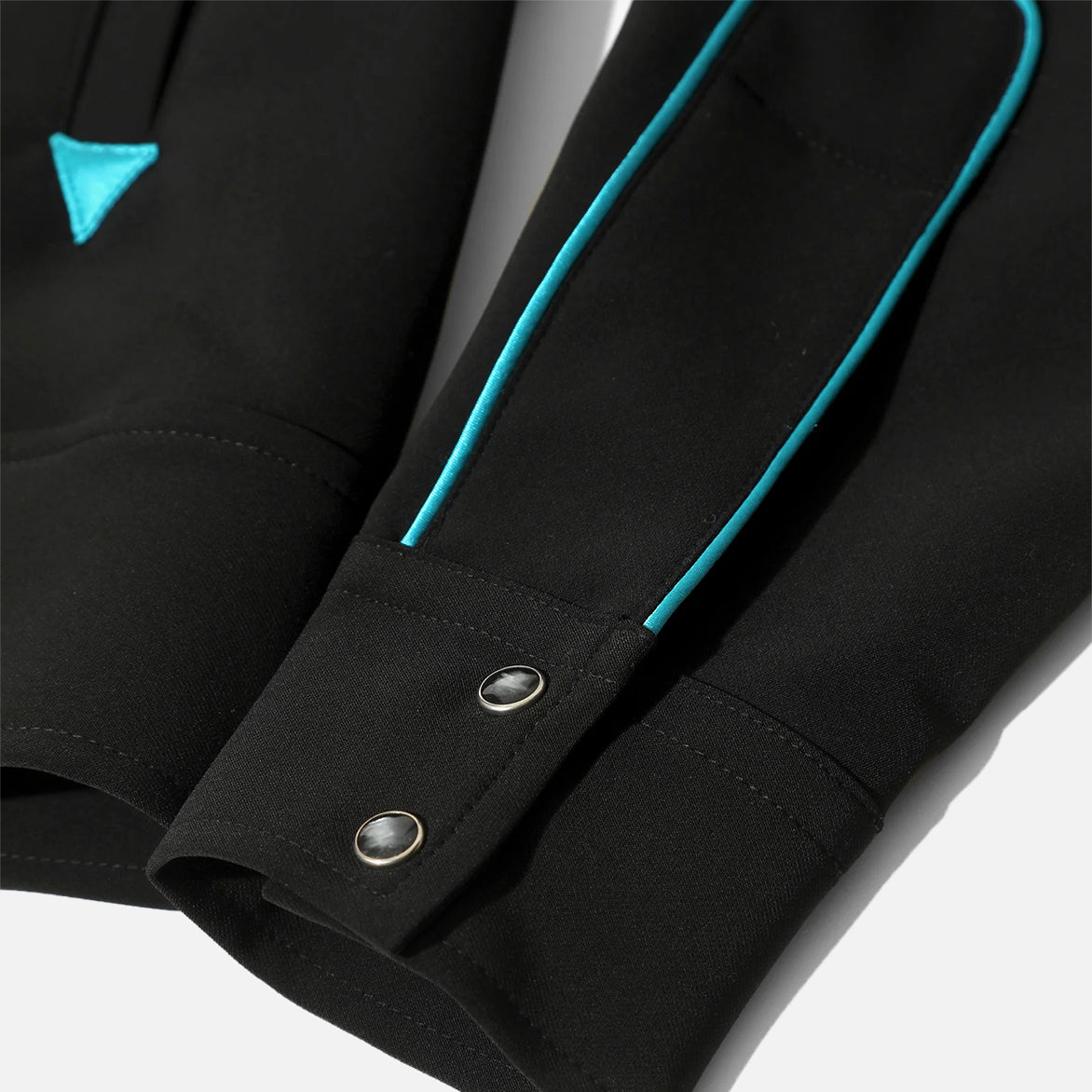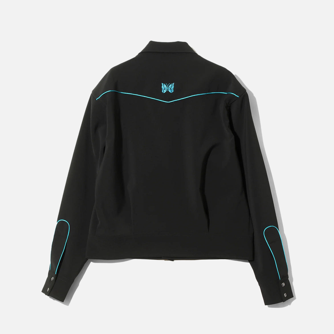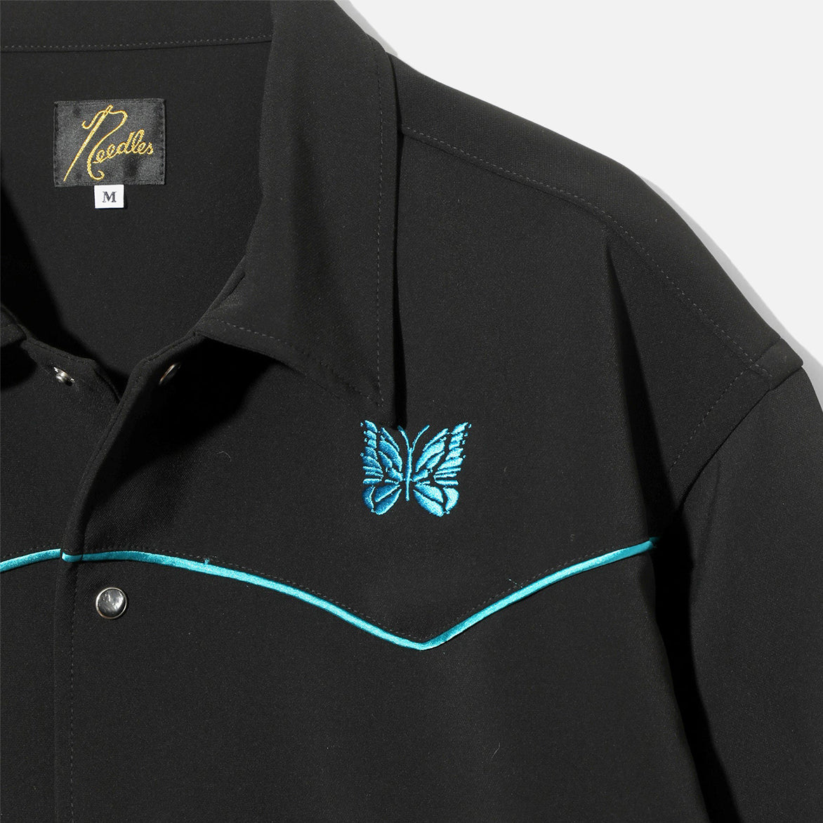 This cowboy shirt jacket features a well-balanced design with a short length and wide width. Decorative western-inspired details, such as piping, butterfly embroidery, and snap buttons, give it a distinctive NEEDLES look. The thick, elastic material complements the jacket's retro feel. Pants are also available in the same material, making this a versatile piece for a stylish look.