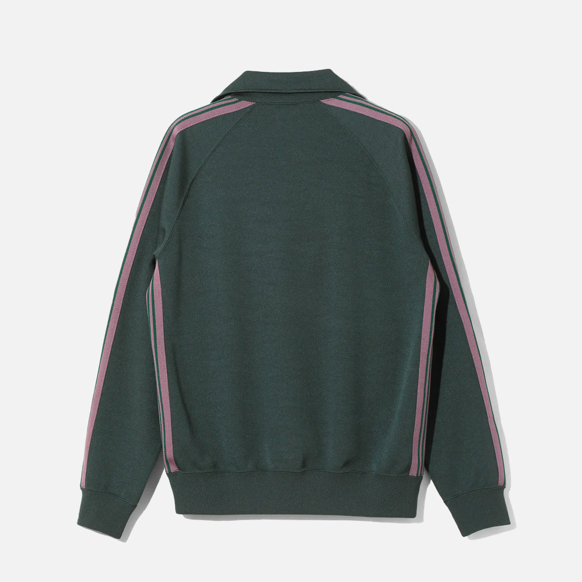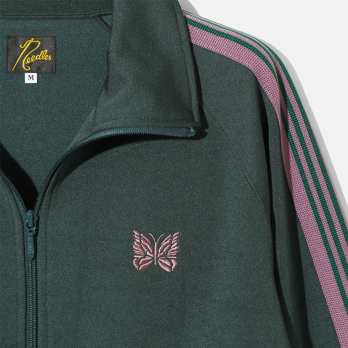 Japanese brand Needles has perfected the iconic look of retro street style with their Track Jacket Poly Smooth. The 100% polyester jacket inhabits the classic "3-Stripes"-style aesthetic with subtly soft, dark green smooth polyester jersey material that features pink striped webbing on the sleeves and side seams, two front zipper pockets and full zip closure in the front. Finishing off the design are ribbed cuffs and waistband, and signature papillon logo embroidery on the chest. Made in Japan.