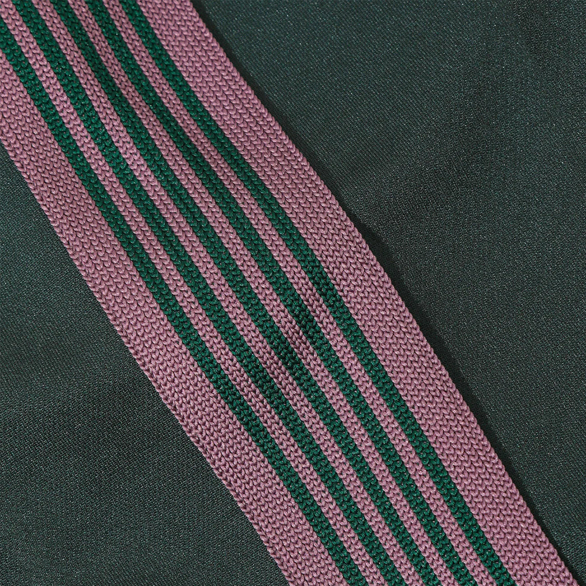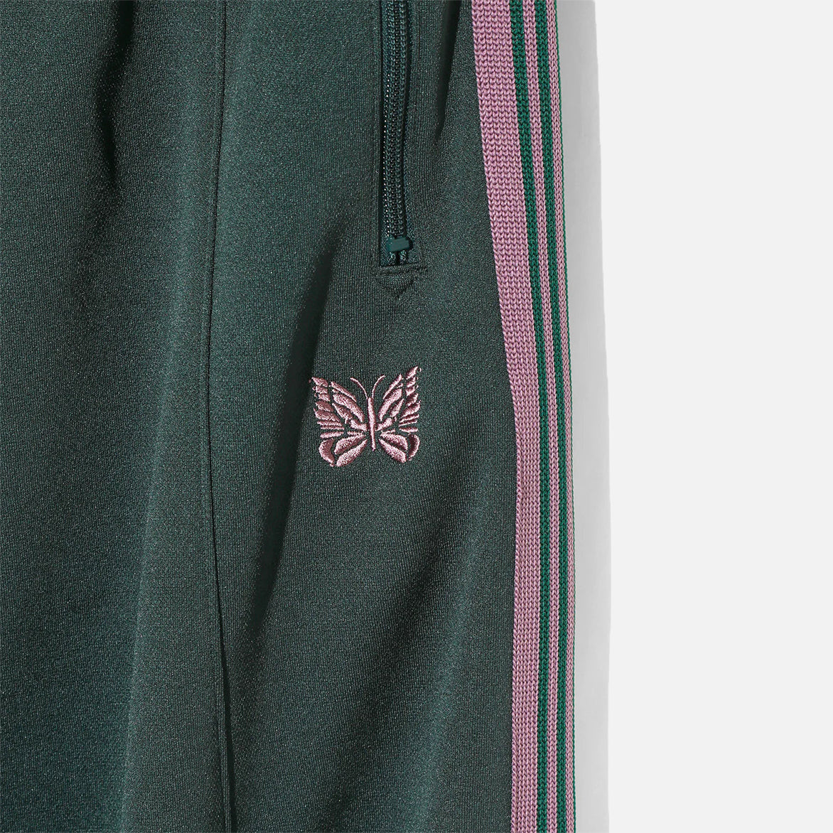 The HD Track Pants take Needles signature track pants in whole new direction by sewing long darts at the waist and hem, giving the pants a unique, eye-catching proportion. The Track Pant style in Poly Smooth provides a loose, comfortable fit perfect for casual wear, and still features green polyester jersey material with pink striped webbing at the sides, two vertical zip hand pockets and single rear zip pocket. An elasticated drawstring waistband and signature papillon logo embroidery at the hip finish off the new look.
