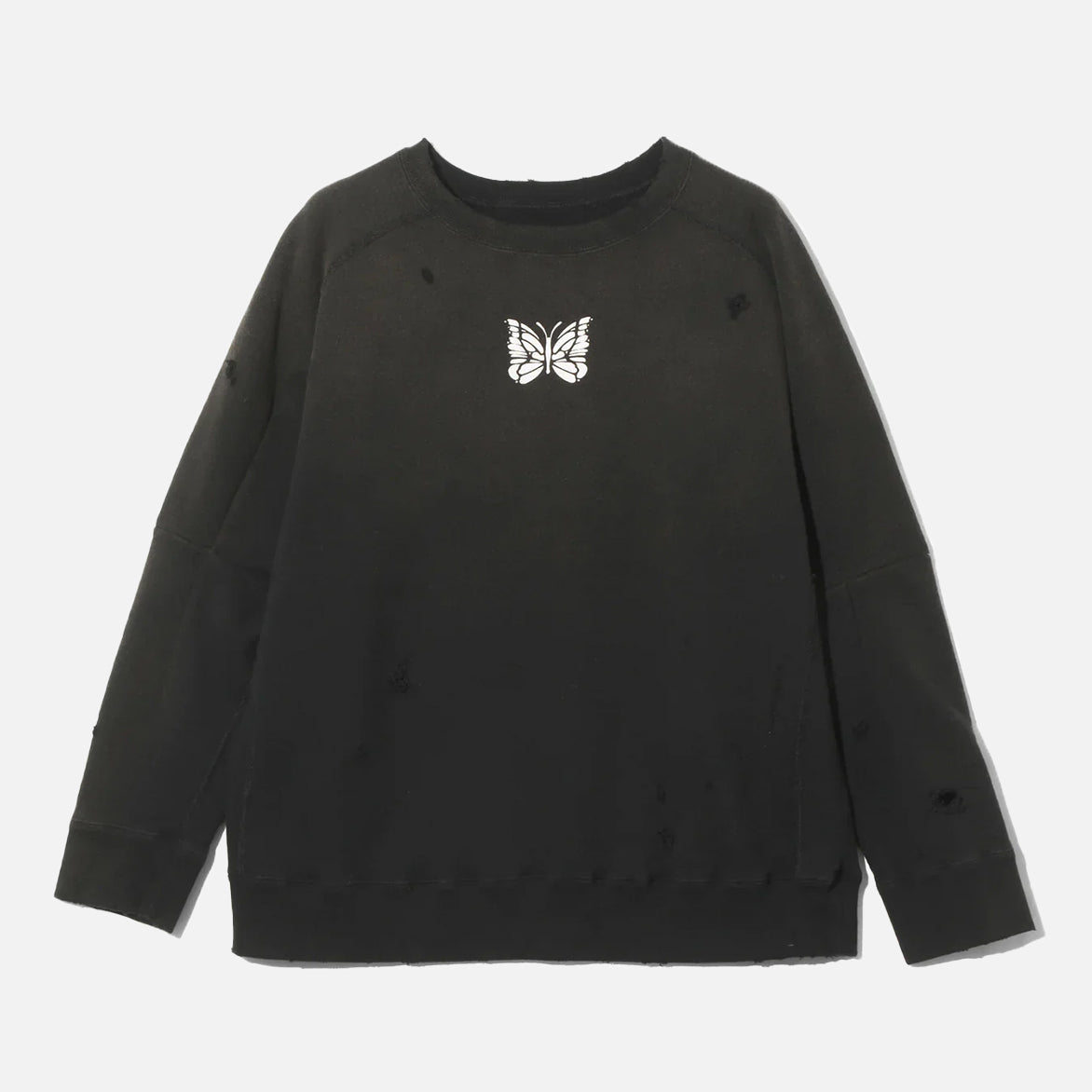 This 100% cotton sweatshirt is washed, faded, and distressed, channeling vintage athletic wear with a lived-in feel. Dart details, and ribbed cuffs, collar and hem create a standout silhouette, while the Needles papillon logo embroidered on the front completes the look.