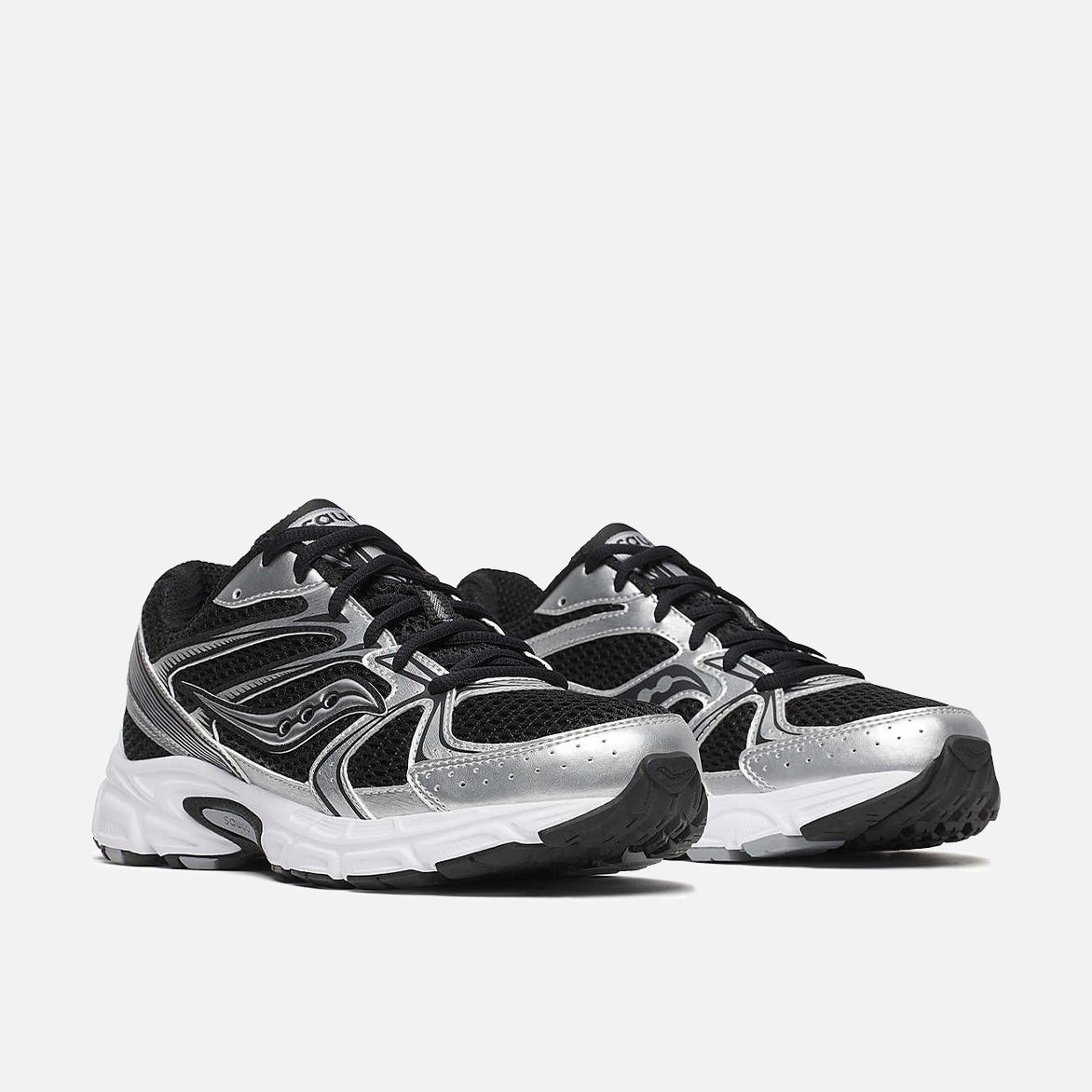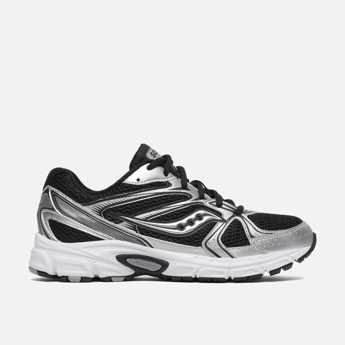 he Saucony Ride Millennium adopts the fervor and iconic details of some of the brand's classic Y2K-era models while incorporating today's most innovative tech. The sleek aesthetic features silver synthetic leather over black mesh on top of a white Grid cushioned midsole. Black branding, laces and lining, and metallic details finish off the look.