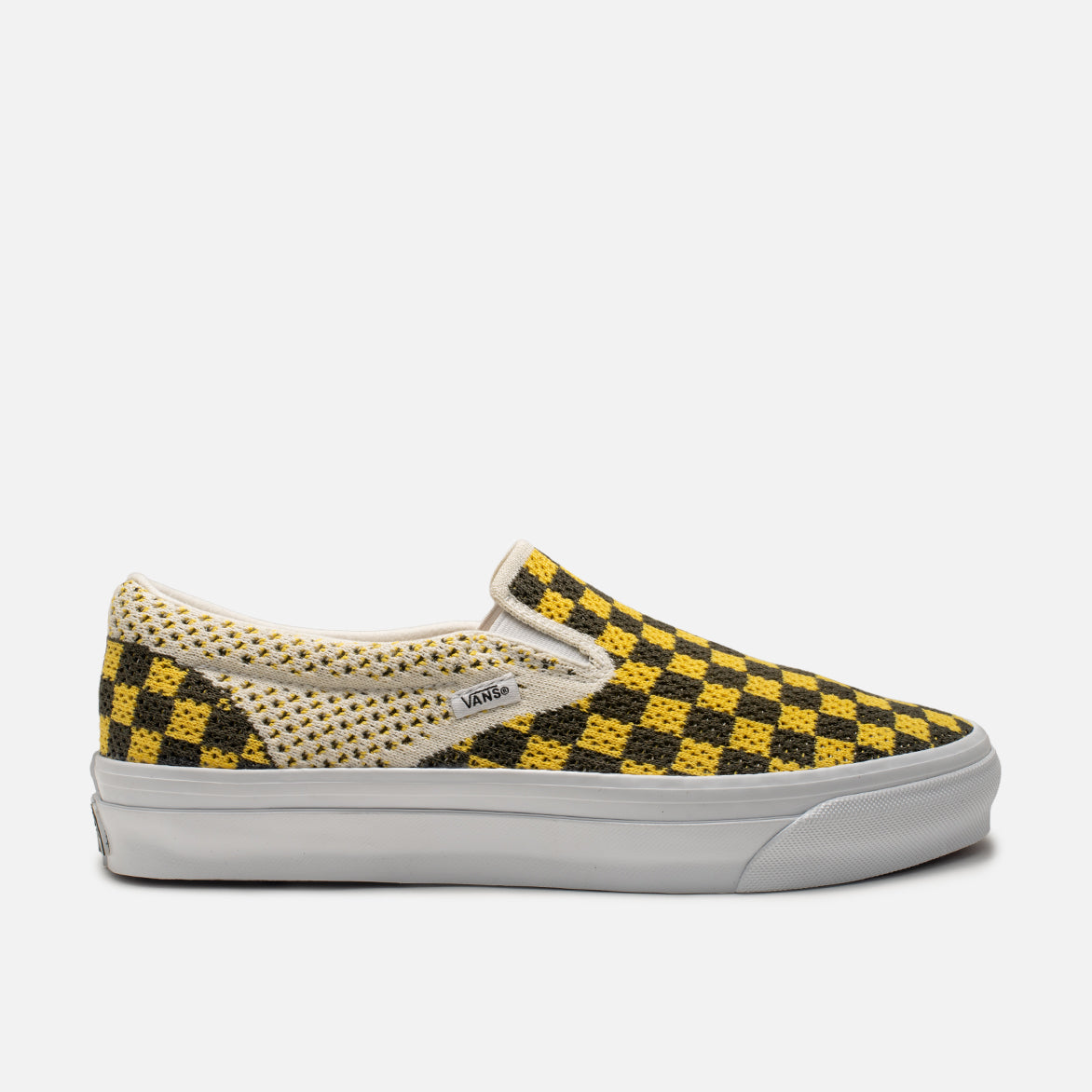 The Vans LX Classic Slip-On 98 EK "Checkerboard" is based on Vans' most iconic model, famously worn by Sean Penn's character in the film Fast Times at Ridgemont High. The classic silhouette is given new life with a reworked knit construction in place of its traditional slip-on canvas upper. It still sits on top of a vulcanized rubber cupsole with the Vans signature gum rubber Waffle outsole, and features elastic side panels, padded collar, woven logo tag at front quarter and yellow "Vans Off The Wall" license plate on the heel.