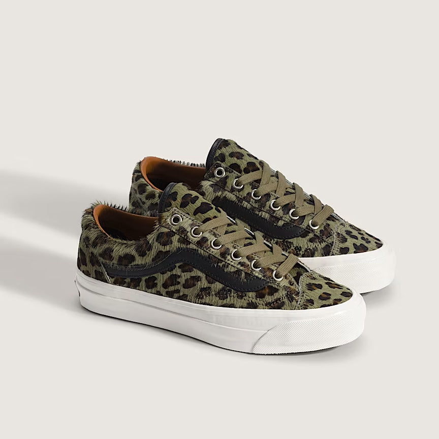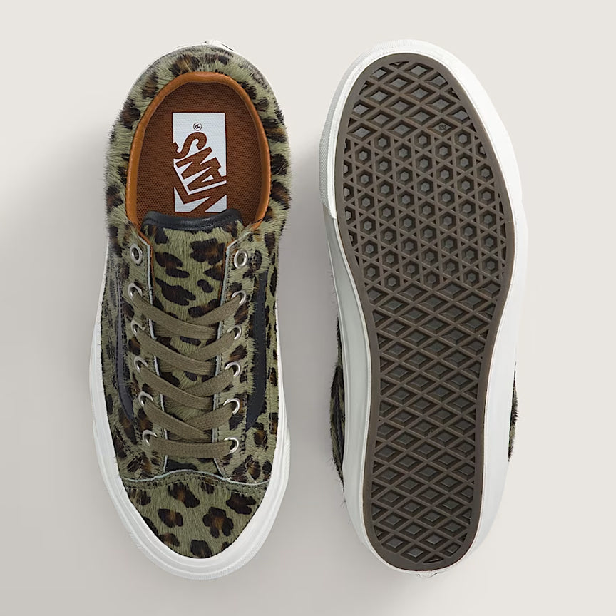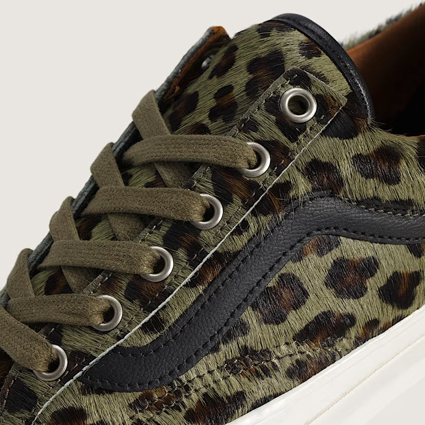 The Vans LX Old Skool 36 PRM "Cheetah" updates Vans' first sidestripe style design from 1977 ina look that hits the spot. This clean and classic new version of the low-top lace-up silhouette features a leather pony hair upper in a Cheetah fur motif with tonal overlays on the toecap, heel and eyestay, and a black leather side stripe. It sits on top of a vulcanized rubber cupsole with the Vans signature gum rubber Waffle outsole that is built to the exact original specs. OG features include high sidewalls with gloss finish, foxing tape inspired by OG '90s outsoles, Sola Foam ADC insoles, padded collar and black "Vans Off The Wall" license plate on the heel.