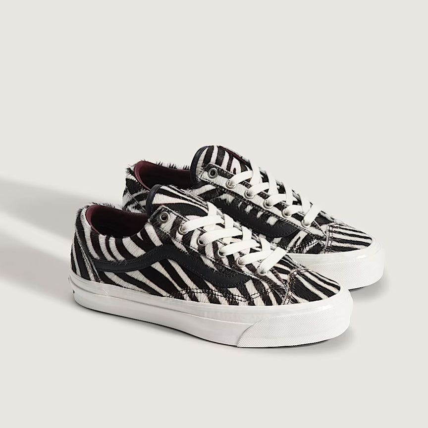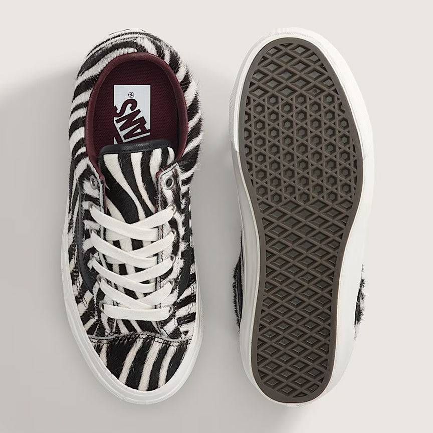 The Vans LX Old Skool 36 PRM "Zebra" updates Vans' first sidestripe style design from 1977 with animal magetism. This clean and classic new version of the low-top lace-up silhouette features a pony hair leather upper in a black and white stripe Zebra motif with tonal overlays on the toecap, heel and eyestay, and a black leather side stripe. It sits on top of a vulcanized rubber cupsole with the Vans signature gum rubber Waffle outsole that is built to the exact original specs. OG features include high sidewalls with gloss finish, foxing tape inspired by OG '90s outsoles, Sola Foam ADC insoles, padded collar and black "Vans Off The Wall" license plate on the heel.