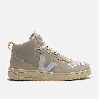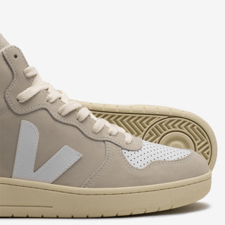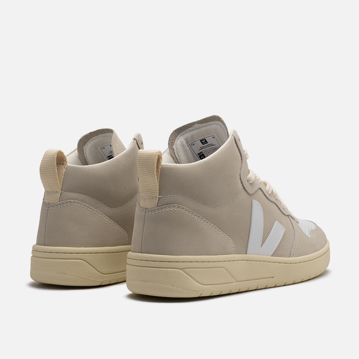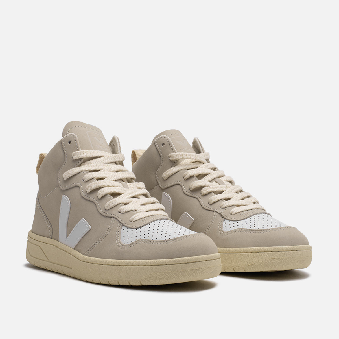 Veja is the most sustainable sneaker company in the world today, sourcing all of its own raw materials and using the most environmentally conscious production methods possible. Their V-15 Nubuck model is a classic basketball-inspired high top silhouette made from chrome-free leather and suede panels sourced in Uruguay and tanned in Brazil according to REACH norms. The suede has been coated in water-repellant oils for extra protection as well. It sits on a sole unit comprised of recycled rubber, recycled EVA, rice waste and sugar cane, while organic cotton laces and a heel loop made from 100% recycled plastic bottles. The shoe is also lined with 100% recycled plastic bottles and features the signature V logo on the side made from recycled rubber and rice waste. Made in Brazil.